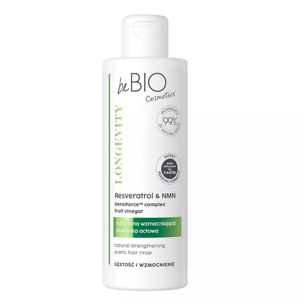 BeBio Ewa Chodakowska Longevity naturalna wzmacniająca płukanka octowa Gęstość i Wzmocnienie 200ml to innowacyjny kosmetyk do pielęgnacji włosów, stworzony na bazie formuł zgłoszonych do patentu. Opracowana w nurcie „cleanical”, łączy moc naturalnych składników z nowoczesnymi technologiami, zapewniając włosom długowieczność, siłę i doskonałą kondycję. Regularne stosowanie płukanki sprawia, że włosy stają się widocznie gęstsze, mocniejsze, odżywione, miękkie i pełne blasku. Produkt jest w 100% wegański oraz testowany dermatologicznie.