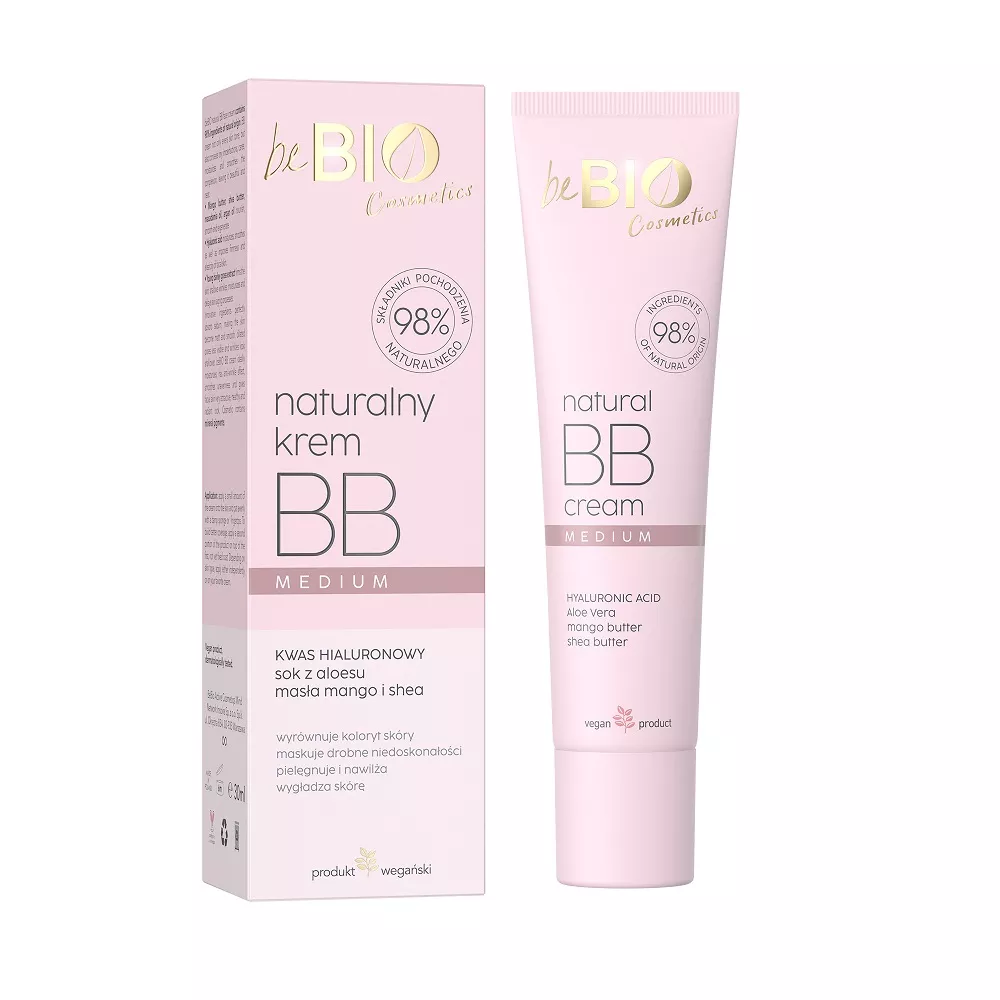 Krem zawiera innowacyjne składniki, które pochłaniają sebum, co sprawia, że cera staje się zmatowiona i gładka. Rozszerzone pory są mniej widoczne, a zmarszczki wyglądają na płytsze. Krem BB beBIO zapewnia doskonałe nawilżenie, działa przeciwzmarszczkowo oraz wygładza nierówności skóry, nadając jej atrakcyjny, zdrowy i promienny wygląd. Kosmetyk zawiera naturalne pigmenty mineralne.