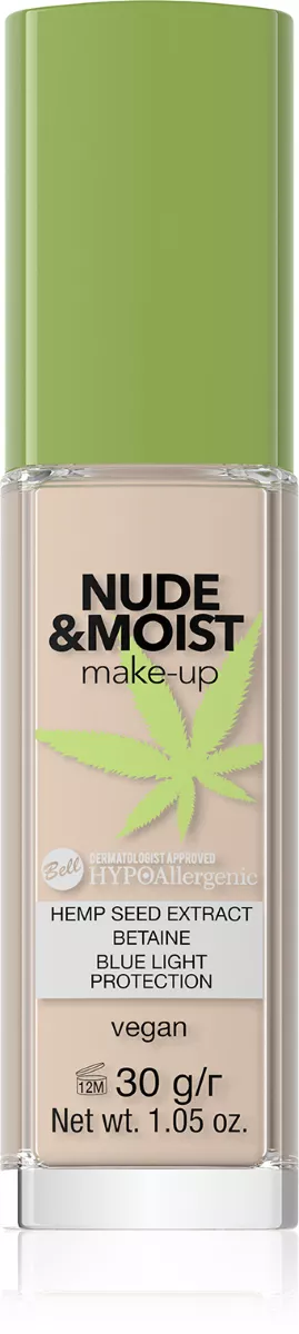 Bell HYPO Nude&Moist Make-Up to lekki, kremowy podkład o możliwości stopniowania intensywności krycia, który doskonale wyrównuje koloryt cery, tuszuje niedoskonałości oraz oznaki zmęczenia. Jego formuła zawiera ekstrakt z nasion konopi, bogaty w witaminy, minerały i antyoksydanty, co zapewnia intensywne nawilżenie, wspomaga elastyczność skóry i poprawia jej ogólne funkcjonowanie.