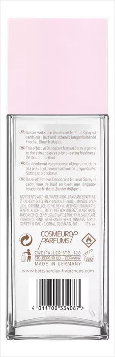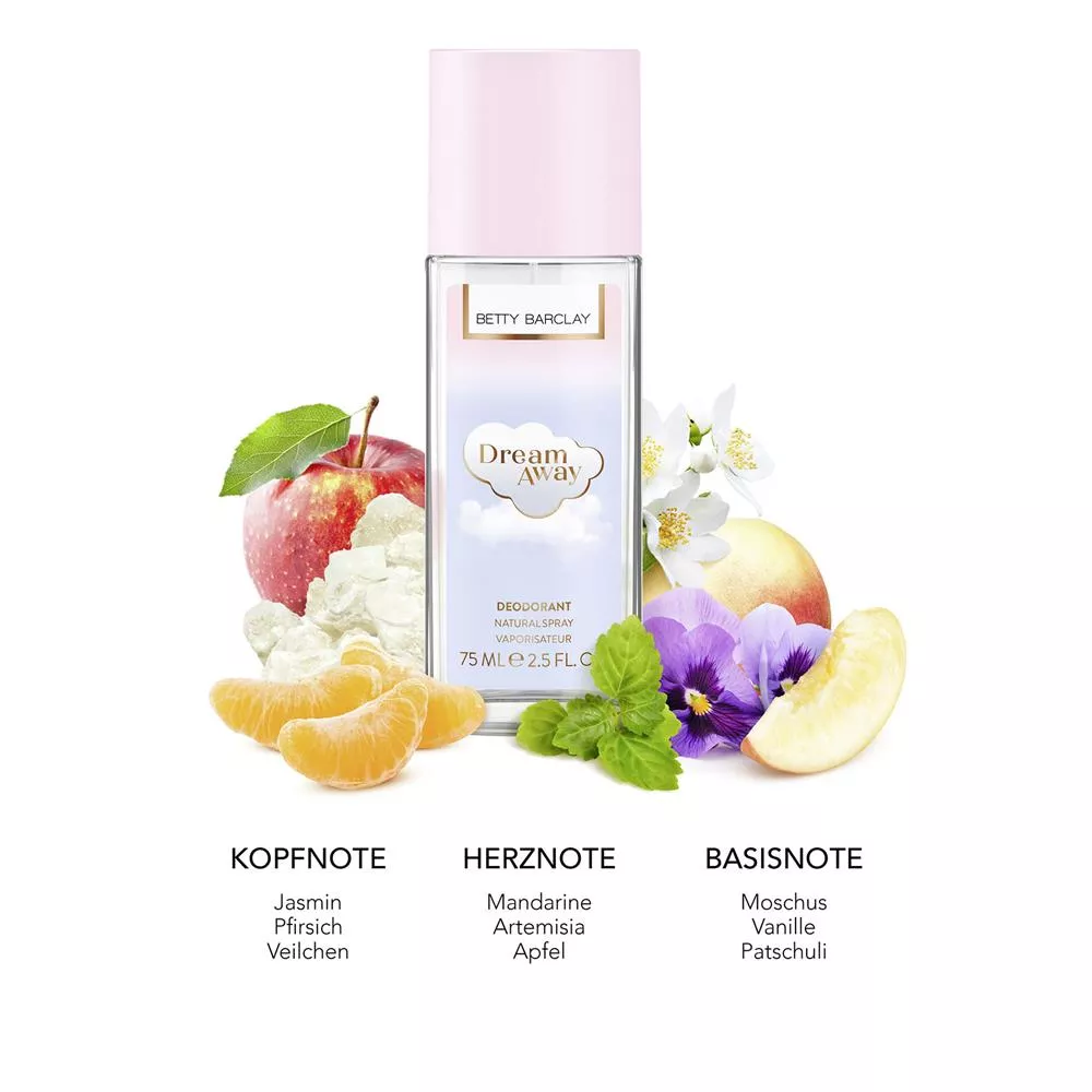 Betty Barclay Dream Away to dezodorant w sprayu o pojemności 75 ml, który pozwala otulić ciało subtelnym, kobiecym zapachem. Doskonale komponuje się z perfumami z tej samej linii, tworząc harmonijną całość i zapewniając poczucie świeżości przez cały dzień. Jego unikalna kompozycja zapachowa to połączenie owocowych i kwiatowych nut, które podkreślają indywidualny styl oraz dodają pewności siebie.