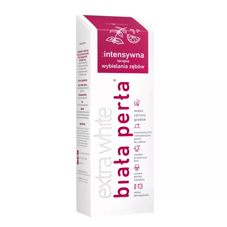 Biała Perła Intensywna Terapia wybielająca pasta do zębów to idealne rozwiązanie dla osób borykających się z głębszymi przebarwieniami szkliwa, wynikającymi z częstego spożywania kawy, herbaty czy barwionych potraw. Dzięki niskiemu wskaźnikowi ścieralności, pasta delikatnie czyści zęby, nie powodując zarysowań. Naturalnie wybiela zęby, usuwa przebarwienia, wzmacnia szkliwo i dziąsła, eliminuje płytkę nazębną, redukuje nadwrażliwość zębów oraz posiada właściwości antybakteryjne.