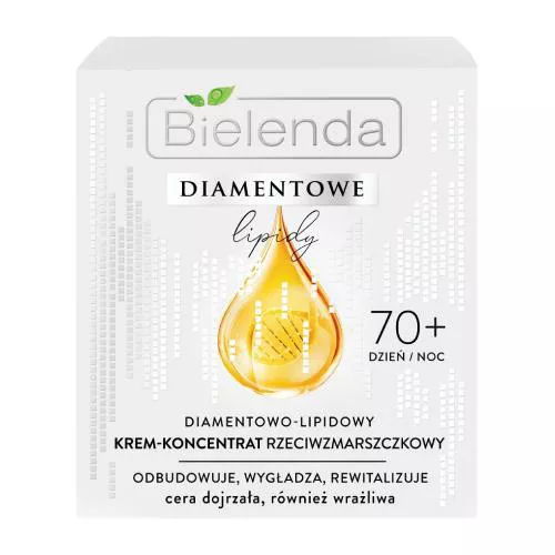 Bielenda Bielenda Diamentowe Lipidy Diamentowo – Lipidowy Krem – Koncentrat Przeciwzmarszczkowy 70+ na dzień i noc to zaawansowany produkt pielęgnacyjny przeznaczony dla cery dojrzałej, wrażliwej i wiotczejącej, z głębokimi zmarszczkami. Bogaty w drogocenne lipidy, zapewnia długotrwałe nawilżenie, rewitalizację oraz głęboką regenerację skóry, jednocześnie wzmacniając jej naturalną barierę wodno-lipidową.