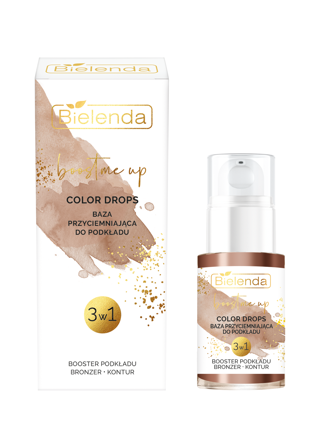 Poznaj Bielenda Boost me up, color drops – innowacyjną bazę przyciemniającą 3w1, która jest prawdziwym boosterem podkładu, bronzerem i produktem do konturowania w jednym! To wielofunkcyjny kosmetyk zamknięty w kremowej formule, który pozwoli Ci idealnie dopasować odcień ulubionego podkładu lub stworzyć efekt naturalnej, opalonej cery. Jeśli Twój podkład jest zbyt jasny, zwłaszcza latem, wystarczy dodać kilka kropli, by uzyskać wymarzony kolor. Dzięki pielęgnującym składnikom aktywnym, baza nie tylko podkreśla urodę, ale również dba o zdrowy, promienny wygląd skóry.