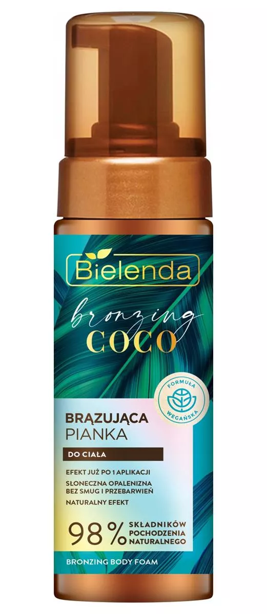 Bielenda Bronzing Coco Brązująca Pianka Do Ciała to lekka pianka brązująca, która zapewnia przyjemną aplikację i pozwala w krótkim czasie uzyskać efekt naturalnej opalenizny. Produkt jest wydajny, szybko się wchłania i już podczas aplikacji nadaje skórze delikatny złoty koloryt, który wzmocni się w ciągu 3-5 godzin po zastosowaniu*. Dzięki delikatnej formule, pianka idealnie rozprowadza się po całym ciele, zapewniając dokładną i równomierną aplikację, co minimalizuje powstawanie smug, zacieków czy plam. Efekt opalenizny wspierany jest przez brązujące działanie ekstraktu z orzecha włoskiego, który utrzymuje się nawet do kilku dni*. Pianka zawiera także pielęgnującą betainę i trehalozę, działające nawilżająco i łagodząco, oraz aromatyczną wodę kokosową.