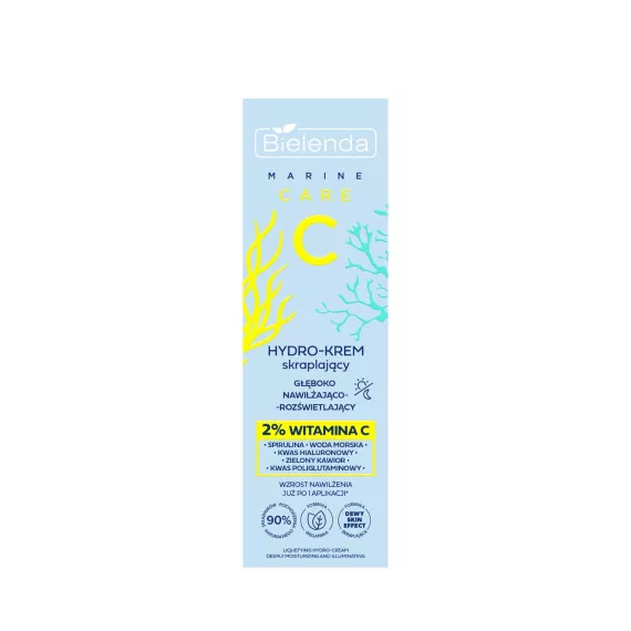 Poczuj głębokie nawilżenie skóry dzięki linii Bielenda C Marine Care. Ta linia łączy skuteczność zaawansowanej formy witaminy C z naturalnością morskich składników aktywnych oraz ultralekkimi hydro-formułami, dając efekt widocznego nawodnienia i rozświetlenia skóry. Krem skraplający Bielenda C Marine Care to lekki, wegański kosmetyk do codziennej pielęgnacji. Doskonale nawilża skórę, rozświetla ją i zwiększa poziom nawodnienia już od pierwszej aplikacji. W swoim składzie zawiera witaminę C, spirulinę, wodę morską, zielony kawior oraz kwas hialuronowy.