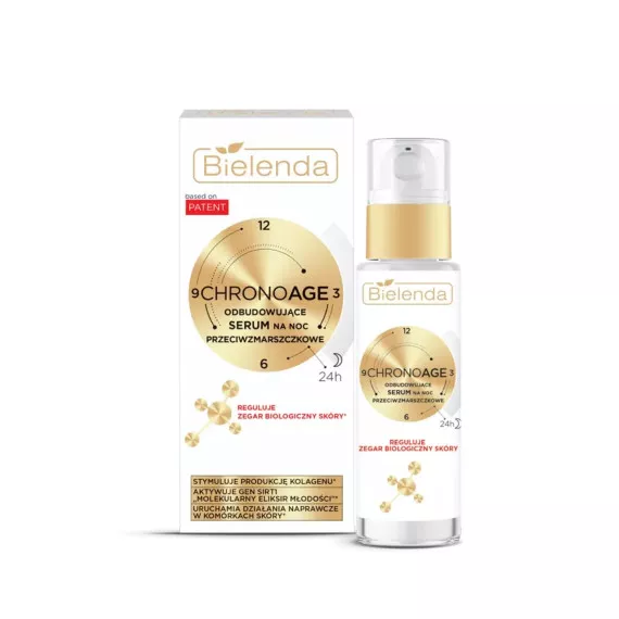 Bielenda Chrono Age 24H, Odbudowujące serum przeciwzmarszczkowe na noc to zaawansowane serum, które skutecznie przeciwdziała procesom starzenia się skóry. Dzięki innowacyjnemu epigenetycznemu kompleksowi odbudowującemu, produkt działa na poziomie genów, regulując ich aktywność oraz zapobiegając uszkodzeniom komórek. Serum pracuje w harmonii z naturalnym rytmem skóry, aktywując się w nocy, gdy skóra jest najbardziej podatna na regenerację. Pomaga odbudować i wzmocnić naturalną barierę ochronną, a także pobudza syntezę kolagenu, co zwiększa jędrność i elastyczność skóry. To idealne rozwiązanie, aby cieszyć się młodym i pięknym wyglądem.
