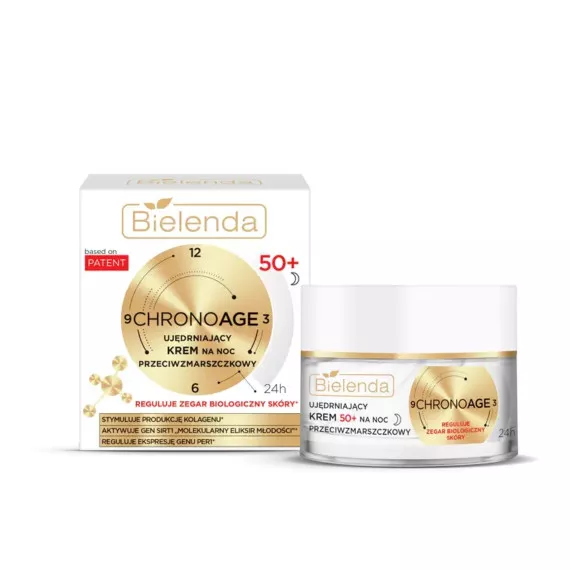 Bielenda Chrono Age 24H to ujędrniający krem przeciwzmarszczkowy na noc stworzony specjalnie dla osób powyżej 50. roku życia. Dzięki zaawansowanej formule, krem skutecznie ujędrnia i wygładza skórę, poprawiając jej elastyczność i sprężystość. Wzmacnia i regeneruje naskórek, a epigenetyczny kompleks naprawczy w nim zawarty zapobiega dysregulacji genów zegara biologicznego, zmniejszając podatność komórek skóry na uszkodzenia. Krem działa w synchronizacji z naturalnym nocnym procesem regeneracyjnym skóry, uruchamiając działania naprawcze na wszystkich jej poziomach, odbudowując i wzmacniając naturalny płaszcz lipidowy oraz stymulując produkcję kolagenu. Regularne stosowanie kremu Bielenda Chrono Age na noc pozwala na intensywną rewitalizację skóry.