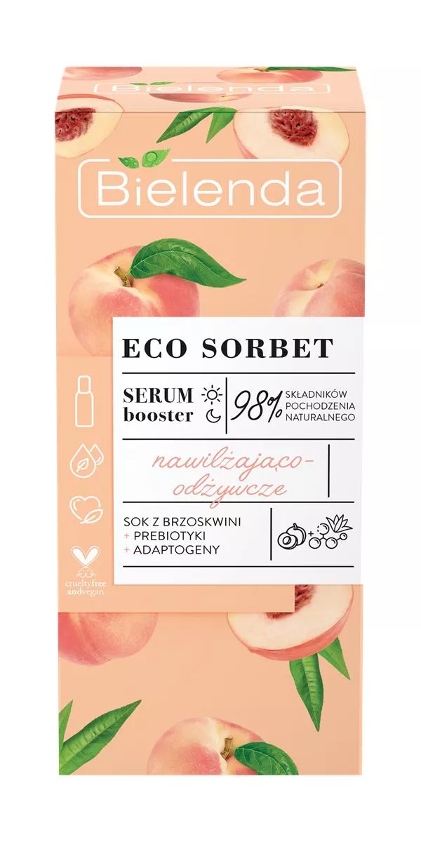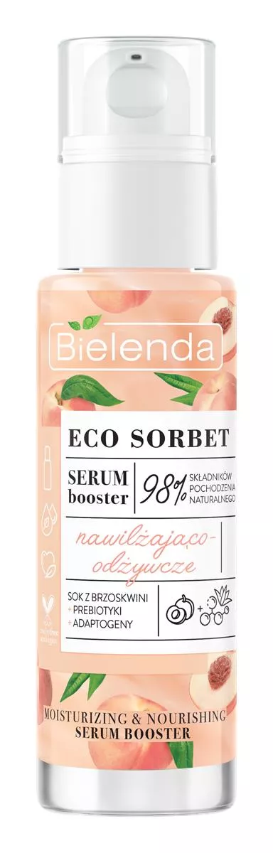 Bielenda Eco Sorbet Brzoskwinia - Serum Booster to nawilżająco-odżywcze serum, które dostarcza Twojej skórze orzeźwiającej, owocowej pielęgnacji. To lekkie, wegańskie serum jest idealnym rozwiązaniem dla skóry potrzebującej intensywnego nawilżenia i odżywienia. Dzięki skoncentrowanej dawce składników aktywnych, serum doskonale nawilża naskórek, likwidując uczucie napięcia i suchości. Jego lekka formuła szybko się wchłania, nie obciąża skóry i nie pozostawia uczucia lepkości.