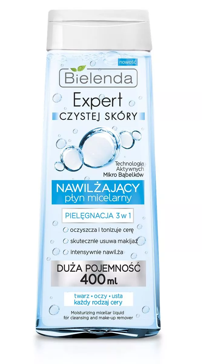 Bielenda Expert Czystej Skóry Nawilżający Płyn Micelarny 3w1 to innowacyjne rozwiązanie do codziennej pielęgnacji twarzy, oczu i ust. Produkt o pojemności 400 ml skutecznie zastępuje mleczko, tonik, mydło i wodę, oferując kompleksowe oczyszczanie i pielęgnację. Dzięki technologii Miceli, płyn błyskawicznie usuwa makijaż, nadmiar sebum oraz wszelkie zanieczyszczenia, pozostawiając skórę świeżą i idealnie oczyszczoną.