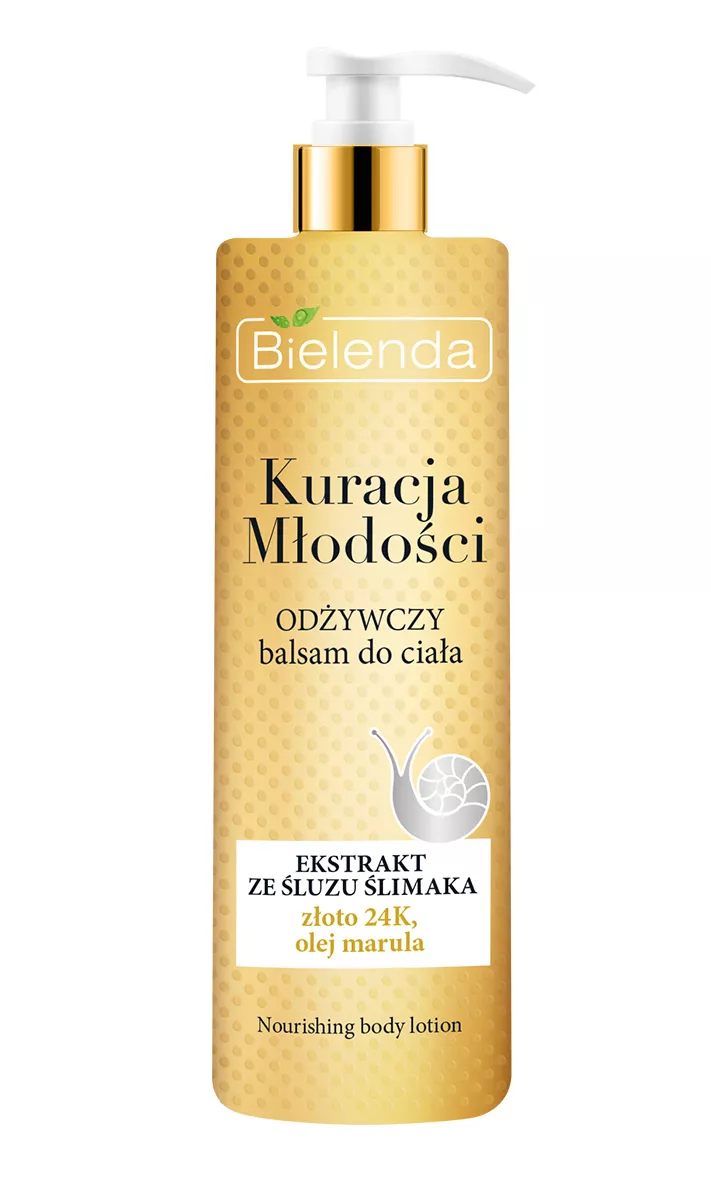 Bielenda Kuracja Młodości Odżywczy Balsam Do Ciała to wyjątkowy kosmetyk, który bazuje na innowacyjnych składnikach, takich jak ekstrakt ze śluzu ślimaka, złoto 24K oraz olej marula. Te składniki zapewniają głęboką odbudowę, naprawę oraz regenerację skóry, a także intensywne nawilżenie i ochronę przed procesami starzenia. Balsam nie tylko poprawia wygląd i kondycję skóry, ale także skutecznie odżywia, wygładza, nawilża i zmiękcza skórę, jednocześnie zwiększając jej jędrność i sprężystość.