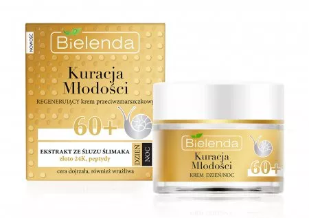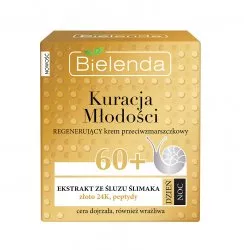 Bielenda Kuracja Młodości Regenerujący Krem Przeciwzmarszczkowy 60+ to zaawansowany kosmetyk, który widocznie poprawia wygląd i kondycję cery dojrzałej. Dzięki swojej unikalnej formule, krem regeneruje i napina skórę, pomagając zachować młodzieńczy wygląd i idealny owal twarzy. Skutecznie spłyca nawet głębokie zmarszczki i bruzdy, opóźniając powstawanie nowych. Dodatkowo, krem ujędrnia skórę, zapobiega jej wiotczeniu oraz stymuluje wzrost gęstości i sprężystości. Rozjaśnia przebarwienia, przywracając cerze ładny koloryt i blask, a także głęboko nawilża cienką, przesuszoną skórę.