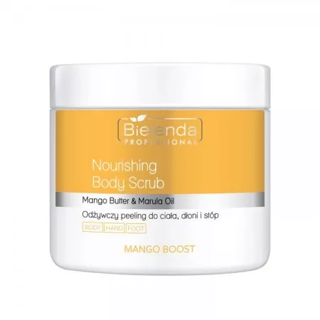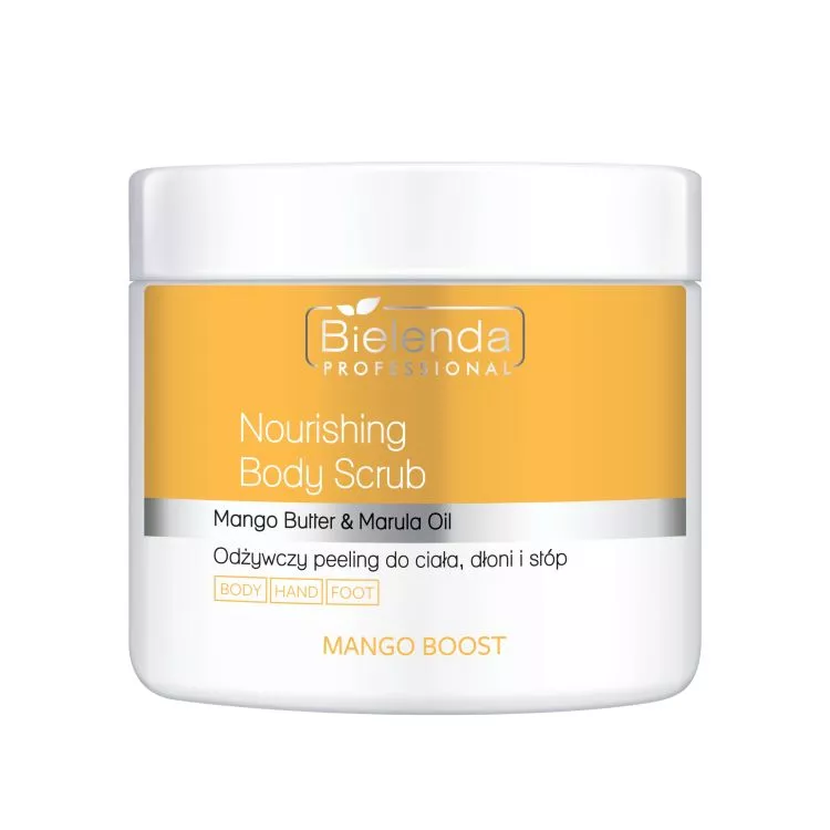 Odkryj odżywczy peeling do ciała, dłoni i stóp Mango Boost od Bielenda Professional, stworzony z myślą o pielęgnacji każdego typu skóry, szczególnie suchej i wymagającej intensywnego odżywienia i regeneracji. Dzięki bogatej formule z masłem mango, ekstraktem z mango, olejem marula, jojoba i awokado, peeling delikatnie złuszcza martwy naskórek, intensywnie nawilża, wygładza i dotlenia skórę, przygotowując ją do wchłaniania kolejnych składników aktywnych. Pozostawia skórę jedwabiście gładką i aksamitną w dotyku.