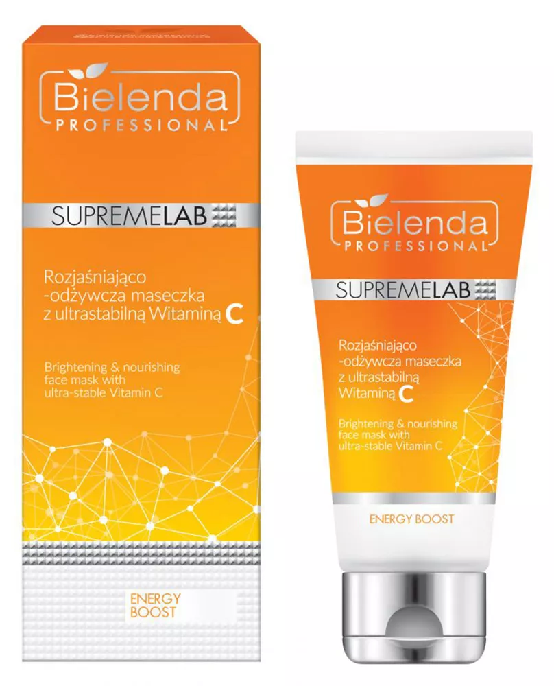 Bielenda Professional Supremelab, Energy Boost to rozjaśniająco-odżywcza maseczka do twarzy, wzbogacona stabilną witaminą C. Produkt ten, przy regularnym stosowaniu, skutecznie przeciwdziała przebarwieniom, poprawia koloryt skóry i chroni przed fotostarzeniem. Dzięki wyjątkowemu połączeniu Ultrastabilnej Witaminy C i Kwasu Ferulowego, maseczka dostarcza skórze bogatą dawkę składników odżywczych. Już po kilkunastu minutach od aplikacji, skóra staje się nawilżona, odżywiona, pełna witalności i blasku. Maseczka wspiera regenerację, wzmacnia naturalne mechanizmy obronne skóry oraz zapewnia ochronę przed stresem oksydacyjnym, zapobiegając wysuszeniu skóry.