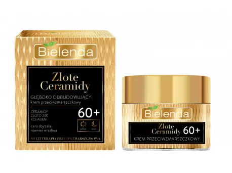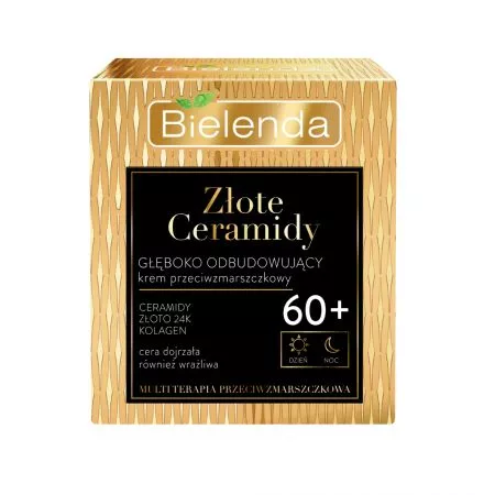 Bielenda Złote Ceramidy Głęboko Odbudowujący Krem Przeciwzmarszczkowy 60+ to zaawansowany produkt pielęgnacyjny przeznaczony do stosowania zarówno na dzień, jak i na noc. Specjalnie opracowany dla cery dojrzałej, krem intensywnie rewitalizuje, wzmacnia i odbudowuje skórę, która z wiekiem staje się cienka, sucha i osłabiona. Dzięki unikalnej formule, produkt optymalnie nawilża, wygładza zmarszczki i dodaje cerze blasku, jednocześnie zmniejszając widoczność przebarwień.