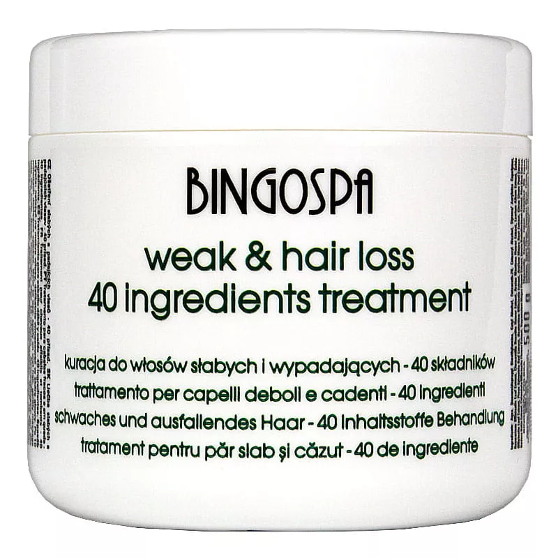 BingoSpa Kuracja do włosów 40 aktywnych składników 500g to zaawansowany kosmetyk, który dostarcza włosom i skórze głowy niezbędnych składników odżywczych. Zawiera roślinny kompleks ponad 40 aktywnych składników, które wspierają prawidłowe funkcjonowanie komórek włosów i skóry głowy.