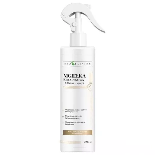 Mgiełka keratynowa do włosów Bioelixire Expert to innowacyjna odżywka regenerująca, stworzona specjalnie, aby przywrócić zdrowy wygląd włosom osłabionym przez czynniki zewnętrzne oraz zabiegi chemiczne. Dzięki swojej lekkiej formule, produkt szybko wygładza, wzmacnia i nabłyszcza kosmyki, nie powodując ich obciążenia. Zawartość keratyny i jedwabiu pomaga wypełnić mikrouszkodzenia w strukturze włosów, sprawiając, że stają się miękkie, elastyczne i pełne blasku.