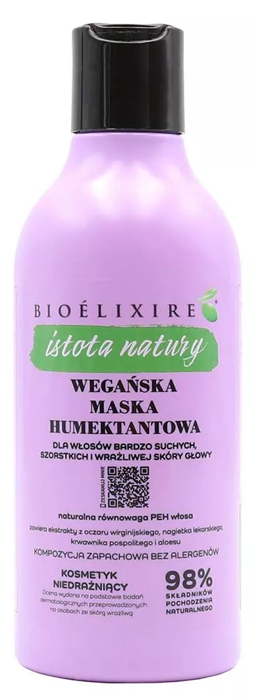 Wegańska maska humektantowa Bioelixire Istota Natury to idealne rozwiązanie dla włosów suchych, szorstkich oraz wrażliwej skóry głowy. Produkt zawiera aż 98% naturalnych składników, które pomagają zachować naturalną równowagę PEH. Maska tworzy ochronny film na włosach, działa antybakteryjnie, przeciwzapalnie i tonizująco, jednocześnie łagodząc podrażnienia. Posiada kompozycję zapachową bez alergenów i jest doskonała do stosowania metodą OMO.