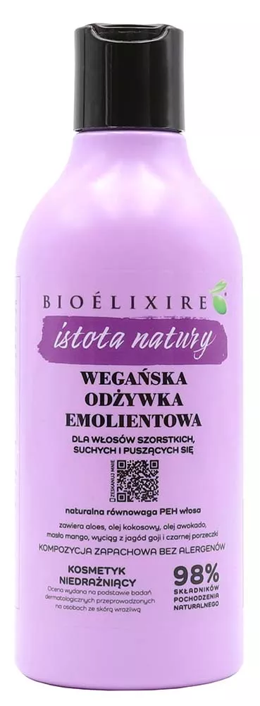 Bioelixire Istota Natury to wegańska odżywka emolientowa, stworzona specjalnie dla włosów suchych, matowych, puszących się oraz trudnych do czesania. Zawiera aż 98% składników pochodzenia naturalnego, co pomaga w zachowaniu naturalnej równowagi PEH. Regularne stosowanie odżywki przywraca włosom elastyczność, połysk, a także wygładza i nawilża je. Produkt posiada kompozycję zapachową wolną od alergenów i może być stosowany do mycia włosów metodą OMO.