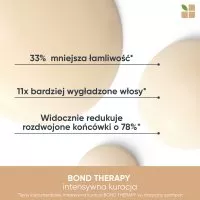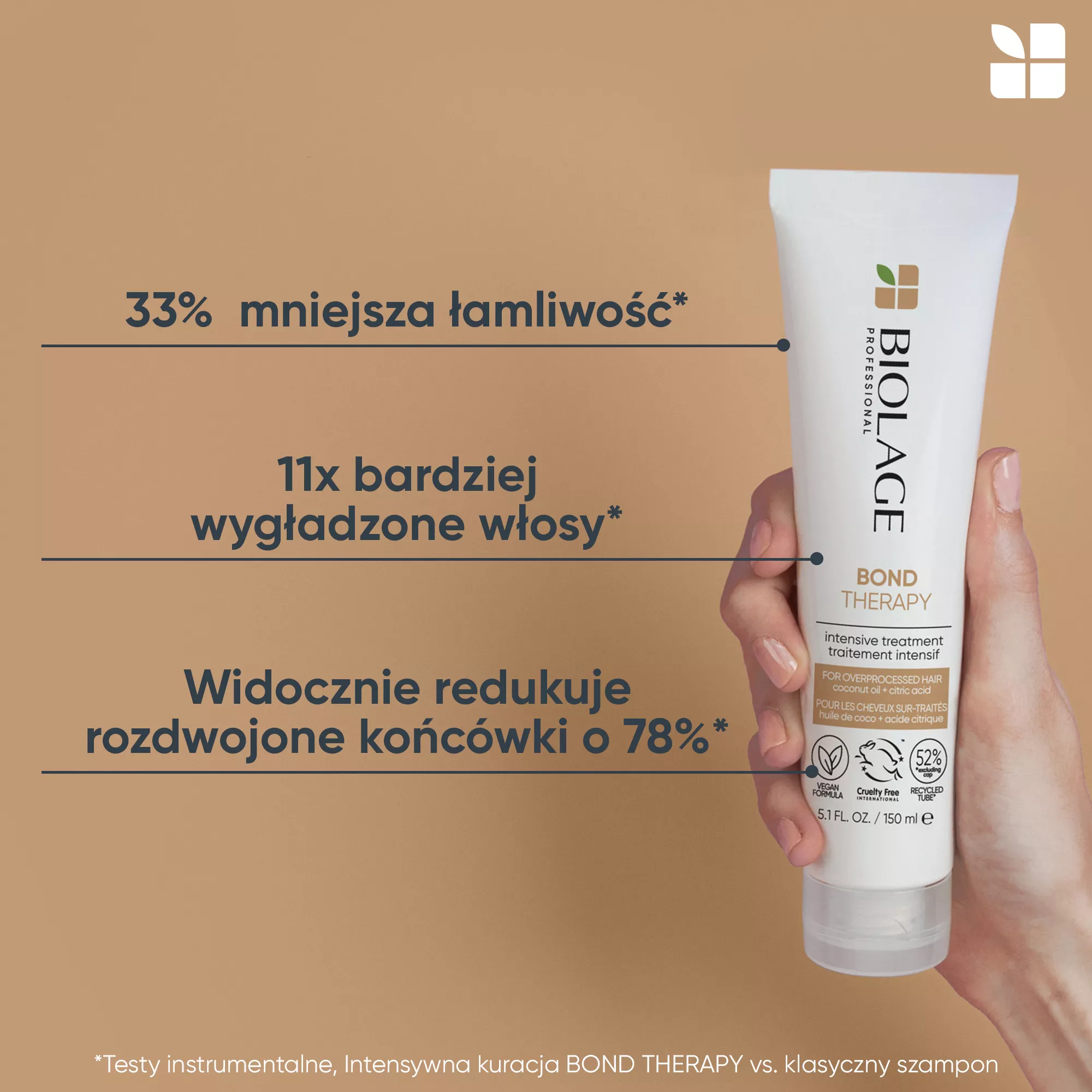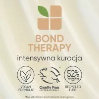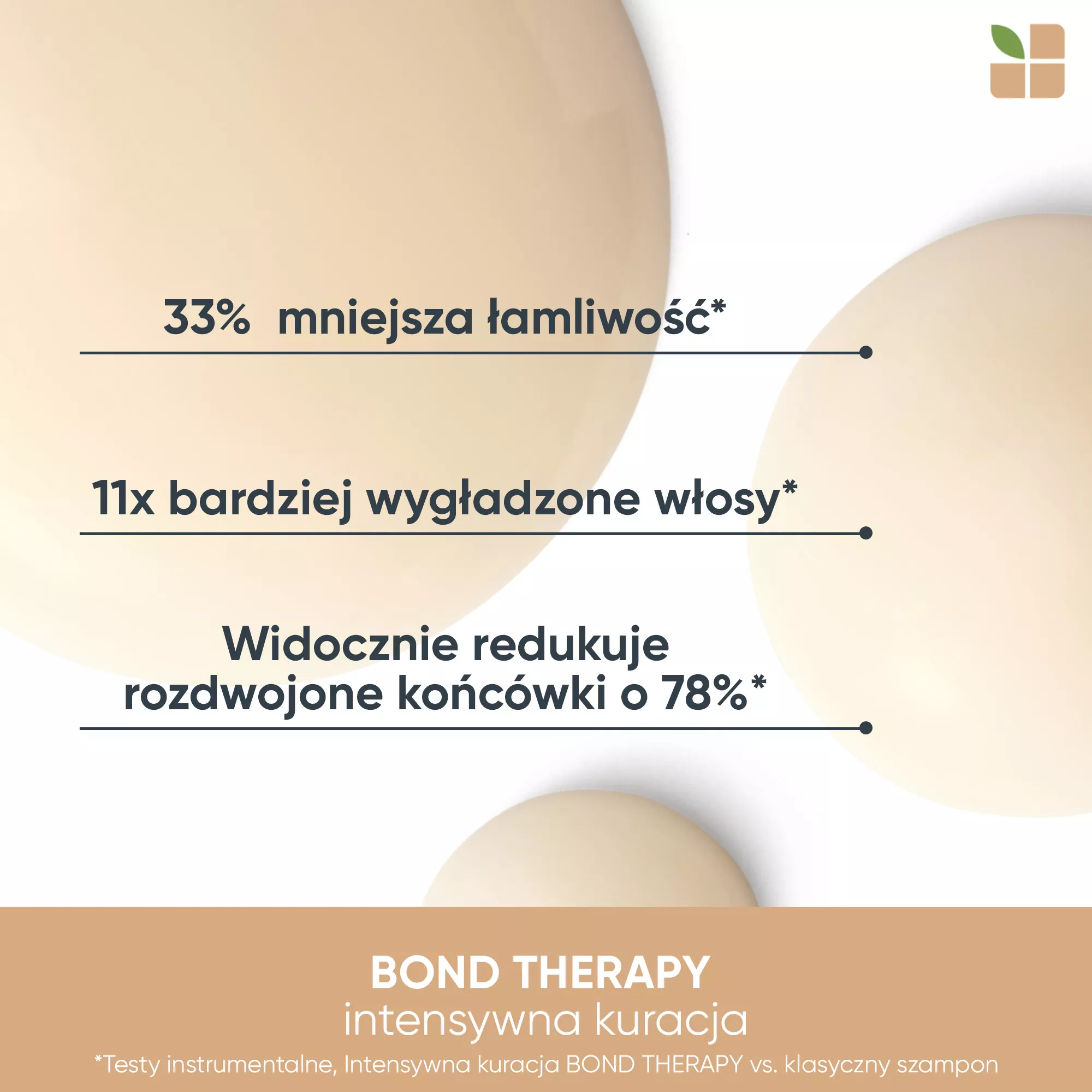 Biolage Bond Therapy to intensywna kuracja wzmacniająca wiązania wewnątrz włosów, która skutecznie redukuje łamliwość oraz widocznie zmniejsza rozdwajające się końcówki. Dzięki innowacyjnej formule włosy stają się łatwe do układania, głęboko odżywione, gładkie i pełne blasku. Kuracja przeznaczona jest do każdego rodzaju włosów, szczególnie osłabionych i podatnych na zniszczenia.