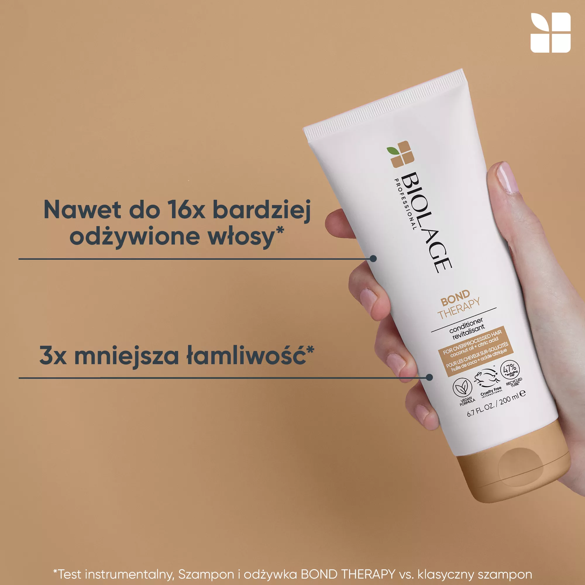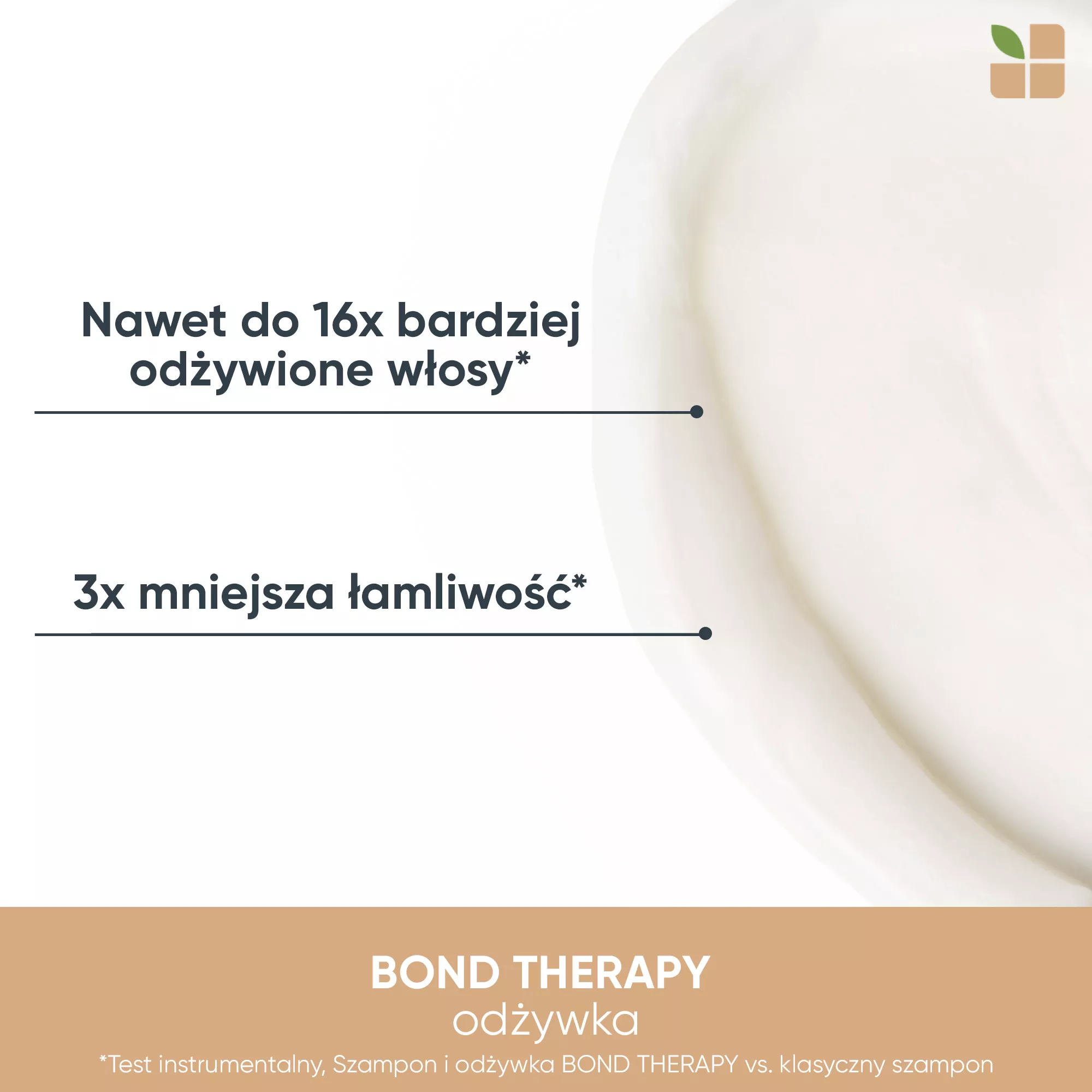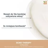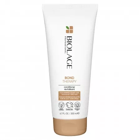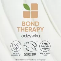 Biolage Bond Therapy to odżywka do włosów wzmacniająca wiązania wewnątrz włosa, przeznaczona do pielęgnacji osłabionych i łamliwych włosów. Dzięki innowacyjnej formule z olejem kokosowym oraz kwasem cytrynowym, produkt delikatnie wygładza, intensywnie odżywia i przyczynia się do zmniejszenia łamliwości, jednocześnie zwiększając podatność włosów na układanie. Regularne stosowanie odżywki sprawia, że włosy stają się miękkie, sprężyste i wyraźnie mocniejsze.