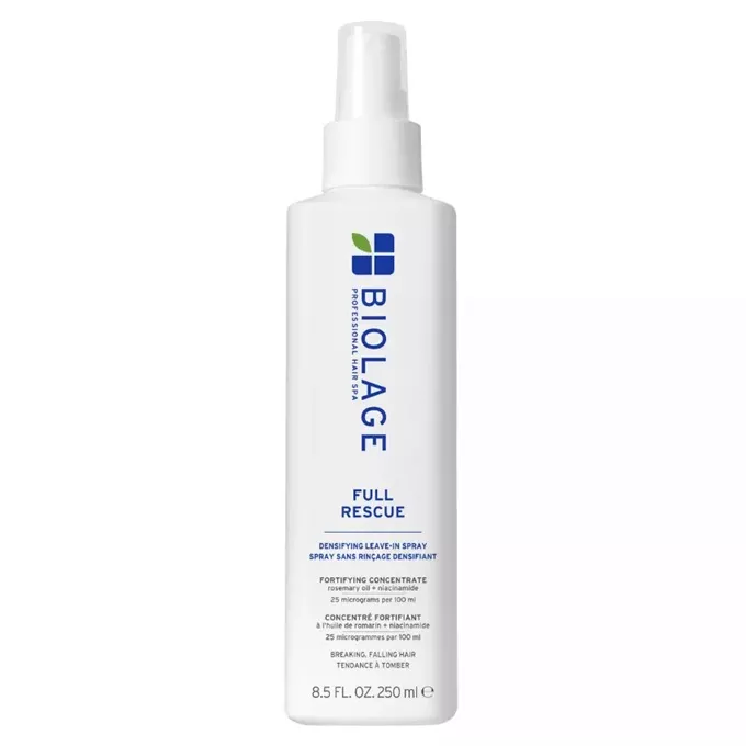 Biolage Full Rescue to profesjonalny, wzmacniający spray do włosów osłabionych, cienkich i przerzedzonych. Zaawansowana formuła z biotyną i ceramidami zapewnia natychmiastowe wzmocnienie i ochronę włókna włosa, zwiększając jego odporność, gęstość oraz witalność – bez efektu obciążenia. Lekka konsystencja idealnie sprawdza się w codziennej pielęgnacji, pozostawiając włosy mocniejsze, grubsze i łatwe do ułożenia.