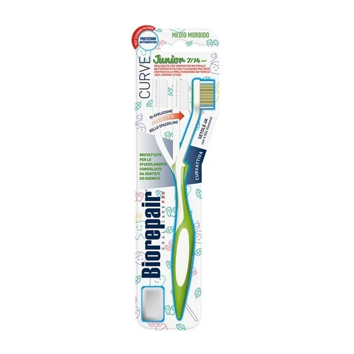 Biorepair Curve Junior zakrzywiona szczoteczka do zębów 7-14 lat to innowacyjne rozwiązanie stworzone z myślą o codziennej higienie jamy ustnej dzieci i młodzieży. Szczoteczka została zaprojektowana tak, by zapewnić skuteczne i jednocześnie delikatne czyszczenie zębów w okresie intensywnego rozwoju oraz ochronę wrażliwych dziąseł. Specjalnie zakrzywiony kształt główki ułatwia dotarcie do trudno dostępnych miejsc, a dodatkowa funkcja czyszczenia języka wspomaga walkę z nieświeżym oddechem i wspiera pełną higienę jamy ustnej.