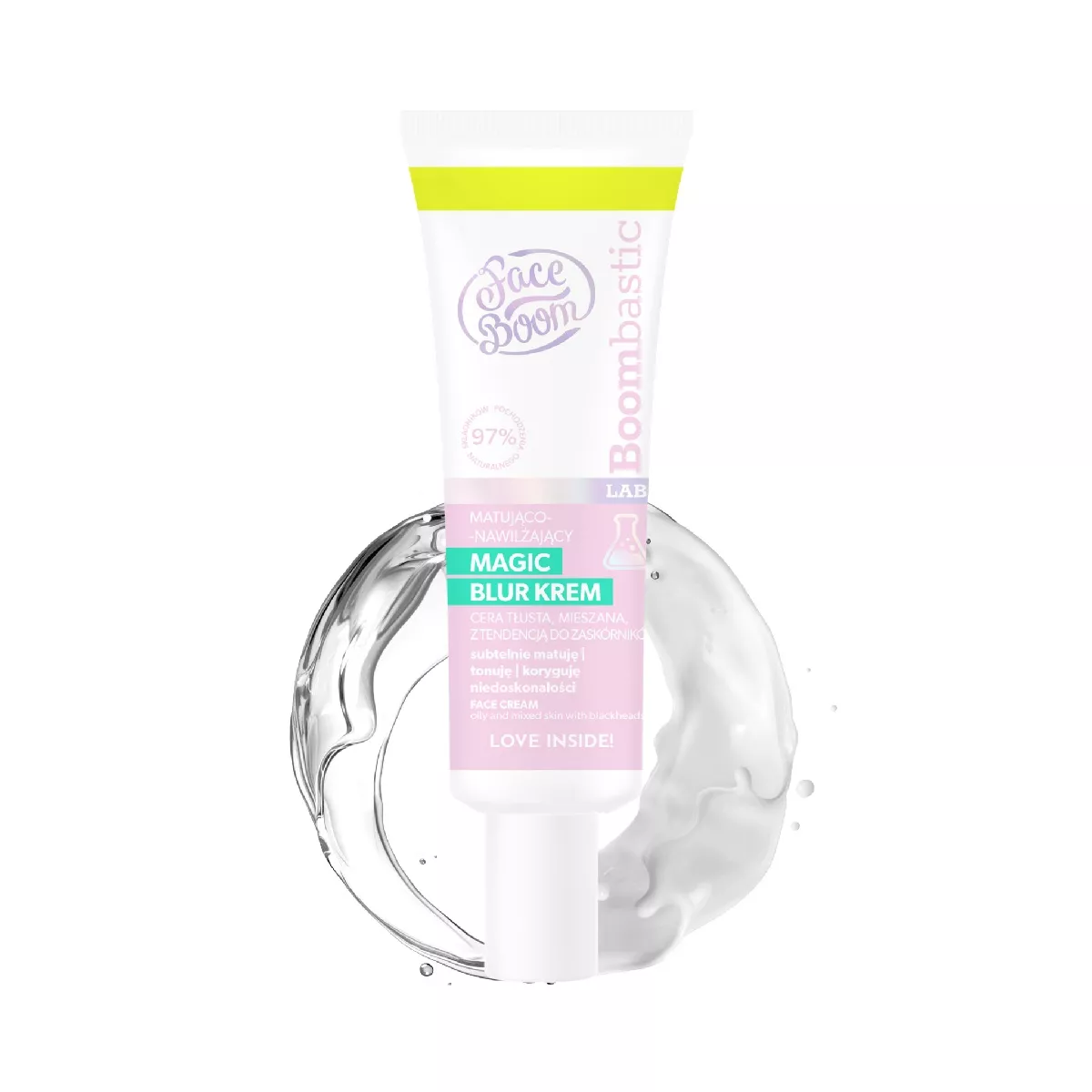 Jako magic blur krem matująco- nawilżający (50 ml) z wegańskimi składnikami z linii Faceboom BOOMBASTIC LAB, jestem idealny dla skóry tłustej i mieszanej ze skłonnością do zaskórników. Moja lekka formuła z tonującymi mikrokapsułkami zapewnia satynowe wykończenie i wyrównuje teksturę skóry.
