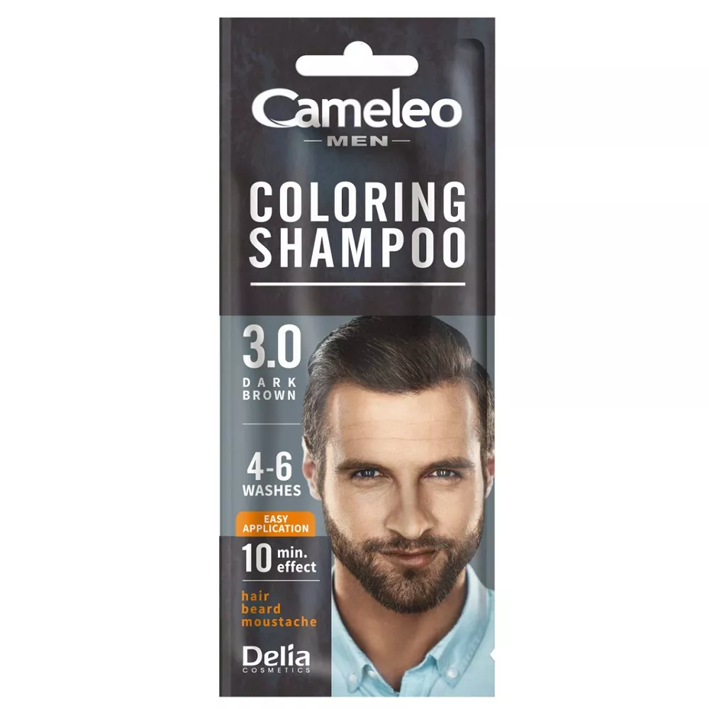 Cameleo Men Coloring Shampoo szamponetka koloryzująca dla mężczyzn 3.0 Ciemny Brąz to rewolucyjne, wegańskie rozwiązanie dla mężczyzn, którzy pragną podkreślić naturalny kolor swoich włosów, brody i wąsów. Szybka i jednorazowa aplikacja pozwala na uzyskanie efektu, który utrzymuje się do 4-6 myć.