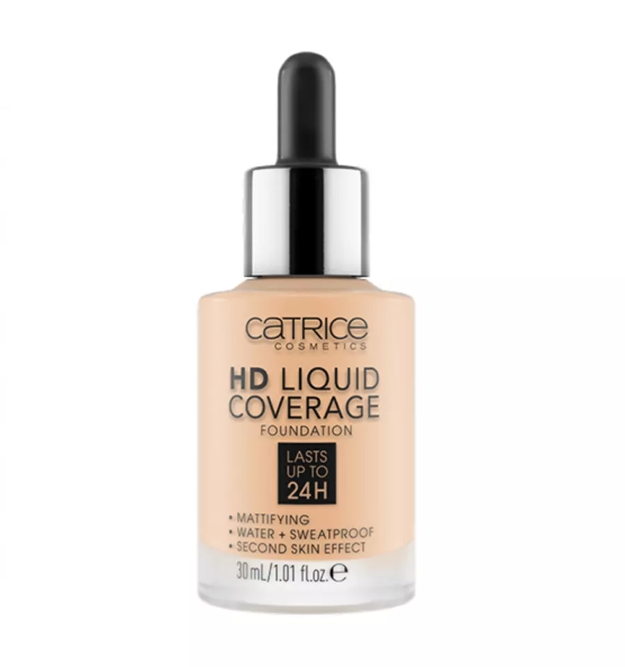 Podkład w płynie Catrice HD Liquid Coverage Foundation sprawia, że cera wygląda nieskazitelnie i naturalnie. Produkt zapewnia wygładzenie cery z efektem „high definition”. Podkład gwarantuje wysokie krycie i utrzymuje się na skórze aż do 24 godzin. Posiada płynną, bardzo lekką formułę, która świetnie kryje wszelkie niedoskonałości oraz wyrównuje koloryt skóry. Co ważne, nie jest wyczuwalny i nie tworzy uciążliwego efektu maski. Dzięki lekkiej konsystencji świetnie się rozprowadza, nie tworząc plam i smug. Wygodna pipeta zapewnia higieniczną aplikację. Kosmetyk doskonale sprawdzi się do zdjęć lub nagrań, ponieważ wysokie krycie zapewnia nieskazitelny wygląd skóry.