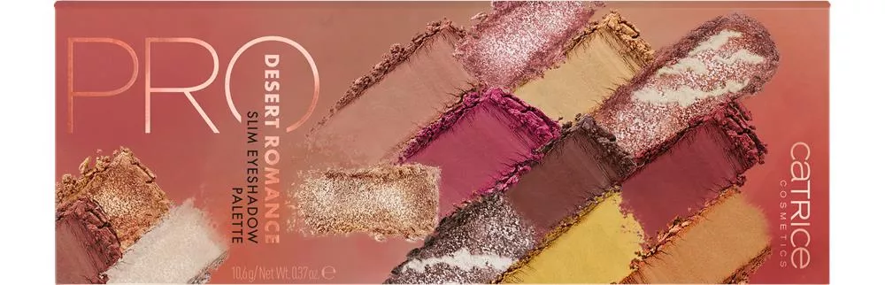 Paleta cieni do powiek Catrice Pro Desert Romance Slim Eyeshadow Palette, 010 Destination Love, to kolejna wyjątkowa propozycja z serii PRO SLIM. Wysokiej jakości papierowe etui mieści w sobie 14 intensywnie napigmentowanych odcieni, które czerpią inspiracje z kolorów pustyni. Znajdziesz tu delikatne odcienie nude i piaskowe, mocne żółcie i róże, a także ziemiste brązy, złota i róże. Różnorodne wykończenia cieni umożliwiają tworzenie wielu efektów i stylizacji, doskonałych zarówno na co dzień, jak i na wyjątkowe okazje.