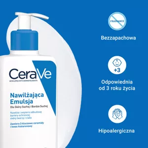 CeraVe Nawilżająca emulsja do suchej i bardzo suchej skóry to produkt opracowany we współpracy z dermatologami, który intensywnie nawilża i wspomaga odbudowę bariery ochronnej skóry. Dzięki trzem kluczowym ceramidom oraz kwasowi hialuronowemu, ta lekka emulsja doskonale koi i regeneruje skórę. Opatentowana technologia MVE stopniowo uwalnia składniki aktywne, zapewniając ciągłe nawilżenie skóry przez cały dzień.