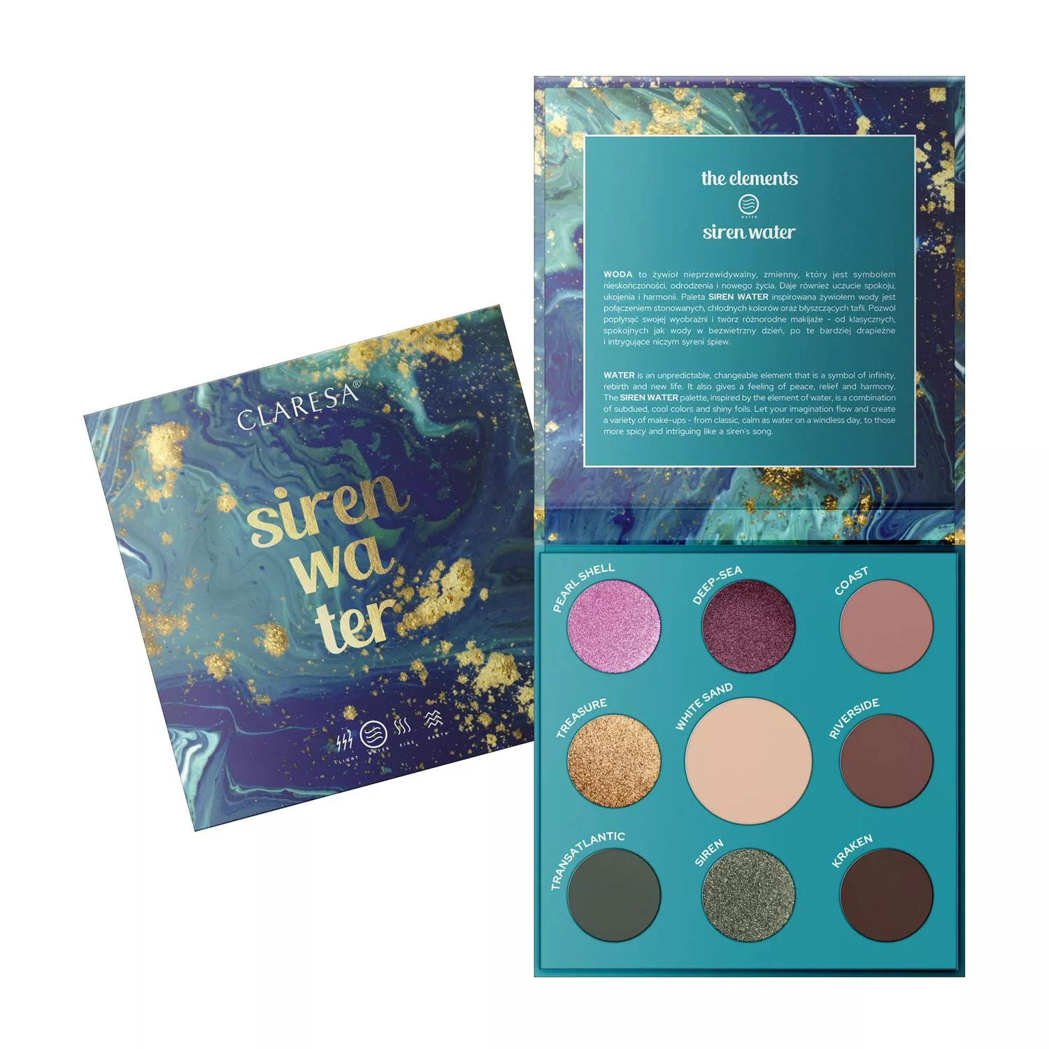 Odkryj siłę żywiołów z kolekcją czterech palet cieni THE ELEMENTS, inspirowaną potęgą natury. Claresa Paleta cieni SIREN WATER przeniesie Cię w świat wody — symbolu nieskończoności, odrodzenia i harmonii. Ta paleta łączy chłodne, stonowane kolory z błyszczącymi taflami, pozwalając na tworzenie makijażu od spokojnego po intrygujący, niczym syreni śpiew.