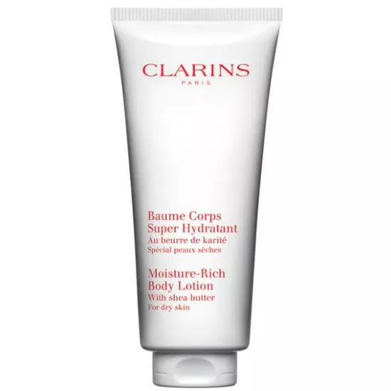 Clarins Moisture-Rich Body Lotion to supernawilżający balsam do ciała, który odżywia i nawilża każdy rodzaj skóry, nawet najbardziej suchą. Dzięki zawartości masła shea oraz naturalnych ekstraktów z organicznej wody malinowej, kwasów z miąższu tamaryndowca i organicznych cukrów owsianych, produkt zmiękcza i wygładza teksturę skóry. Jego topiąca się konsystencja natychmiast się wchłania, pozwalając na szybkie ubieranie się po aplikacji.