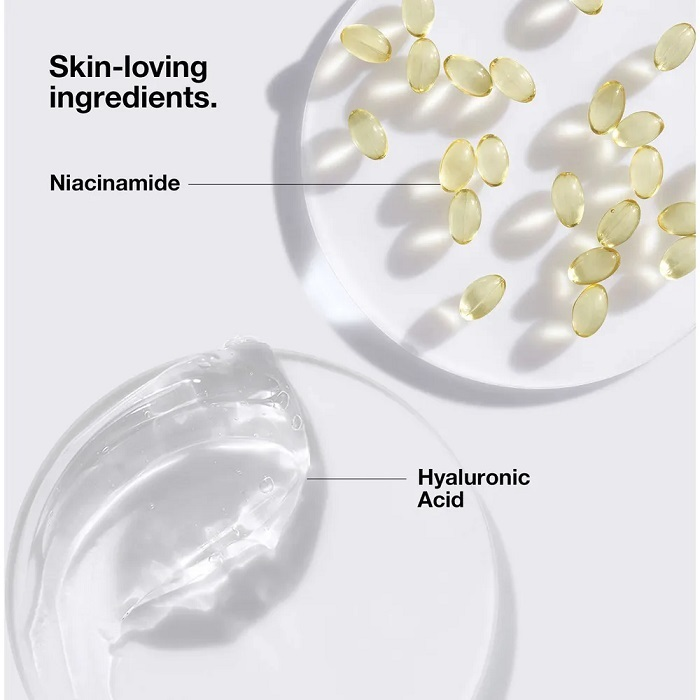 - Formuła z niacynamidem i kwasem hialuronowym pomaga zminimalizować widoczność porów i zmniejszyć błyszczenie.