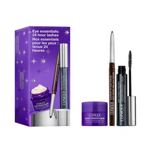 Zestaw Clinique Eye Essential: 24 Hour Lashes to kompleksowa propozycja dla osób, które pragną podkreślić spojrzenie i zadbać o delikatną skórę wokół oczu. W skład zestawu wchodzą trzy starannie dobrane produkty: przeciwzmarszczkowy krem pod oczy o pojemności 15 ml, długotrwały tusz do rzęs (6 ml) oraz precyzyjny eyeliner w kredce (0,14 g). Każdy z nich został przebadany dermatologicznie i okulistycznie, jest odpowiedni dla osób o wrażliwych oczach oraz noszących soczewki kontaktowe. Zestaw jest bezzapachowy i odpowiedni do każdego typu skóry.