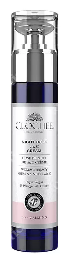 Clochee wzmacniający krem z witaminą C na noc to zaawansowana formuła stworzona specjalnie z myślą o cerach wrażliwych i nadreaktywnych. Starannie dobrane składniki aktywne koją i wyciszają skórę, wzmacniając jej barierę ochronną. Regularne stosowanie kremu przywraca skórze witalność, wyrównuje koloryt i nadaje jej promienny wygląd. Ferment z granatu działa silnie antyoksydacyjnie, hamując procesy starzenia, natomiast ekstrakt z róży damasceńskiej łagodzi podrażnienia. Ekstrakt z kasztanowca zmniejsza widoczność naczynek i niweluje zaczerwienienia, a kolagen akacjowy głęboko nawilża i poprawia jędrność skóry.