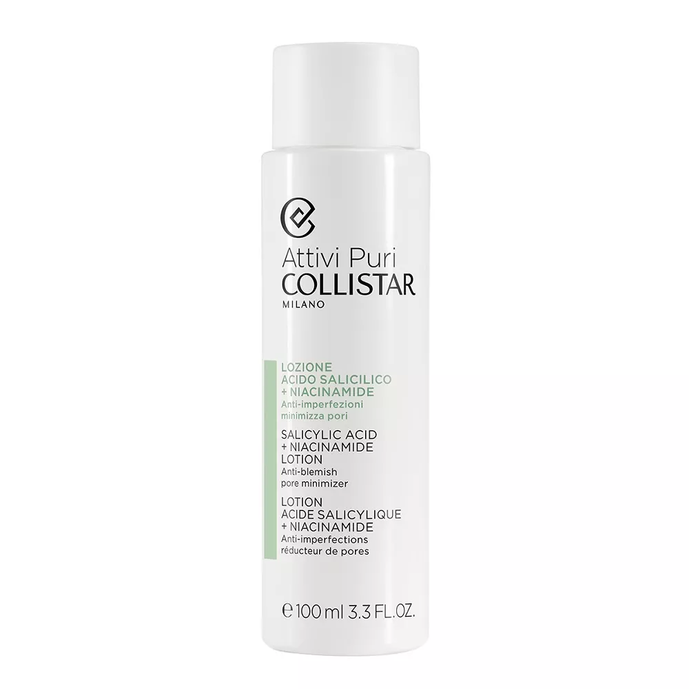 Collistar Attivi Puri Salicylic Acid + Niacinamide Lotion to innowacyjny płyn do pielęgnacji twarzy o nietłustej konsystencji, który łączy moc kwasu salicylowego i niacynamidu. Skutecznie oczyszcza skórę, minimalizuje powstawanie wyprysków oraz wspomaga wnikanie składników aktywnych w głąb naskórka. Połączenie tych dwóch substancji pomaga zmniejszyć widoczność porów i sprawia, że cera staje się wyraźnie gładsza i bardziej promienna.