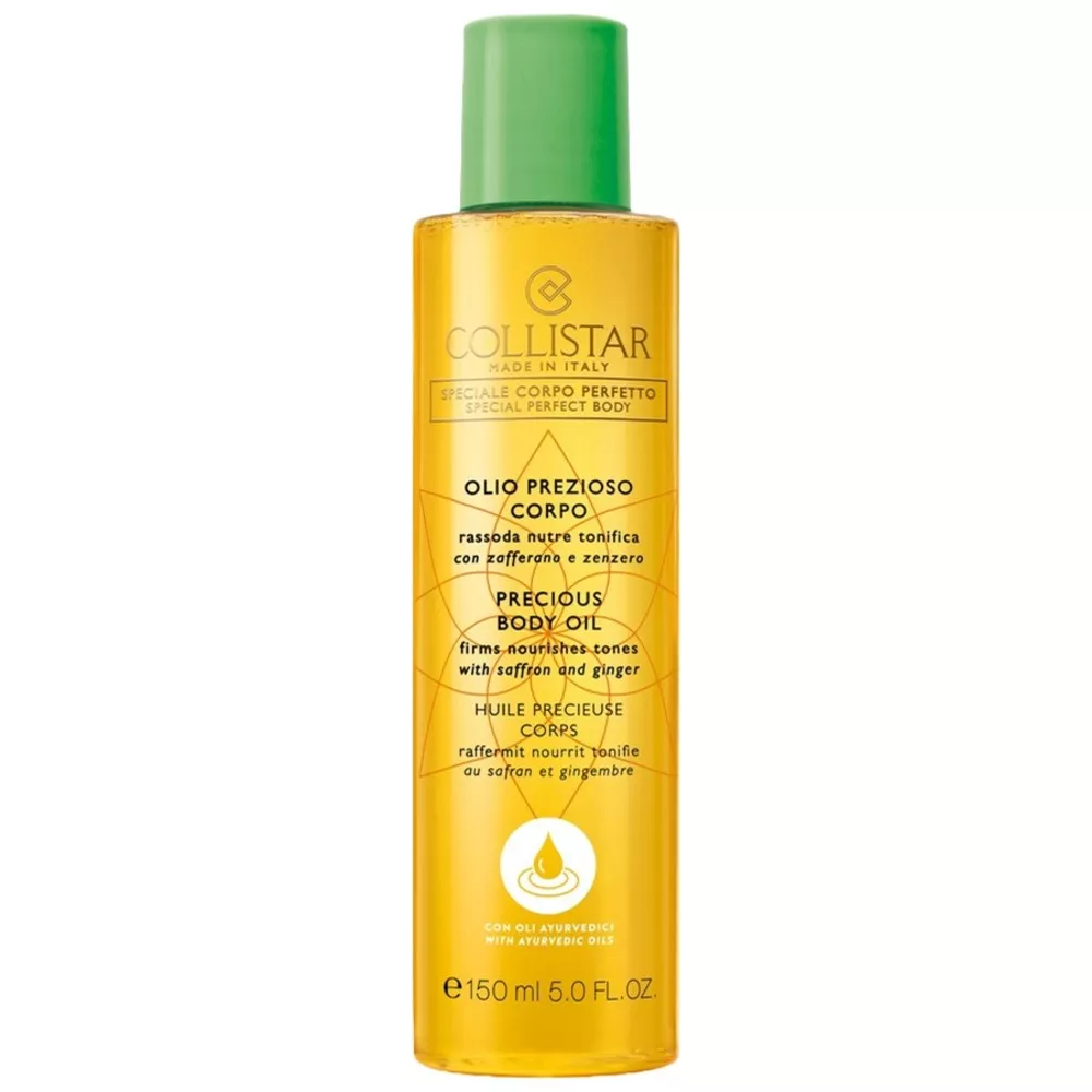 Collistar, Precious Body Oil to intensywnie nawilżający olejek do ciała o pojemności 150 ml, który łączy w sobie bogactwo tradycyjnych ajurwedyjskich olejków, takich jak sezamowy, neem i różany adamaszek. Dzięki swojej unikalnej formule, olejek ujędrnia, odżywia oraz tonizuje skórę, a dodatek szafranu potęguje jego relaksacyjne właściwości. Imbir w składzie pobudza mikrokrążenie, a składnik aktywny pozyskiwany z wanilii wywołuje przyjemne uczucie ciepła.