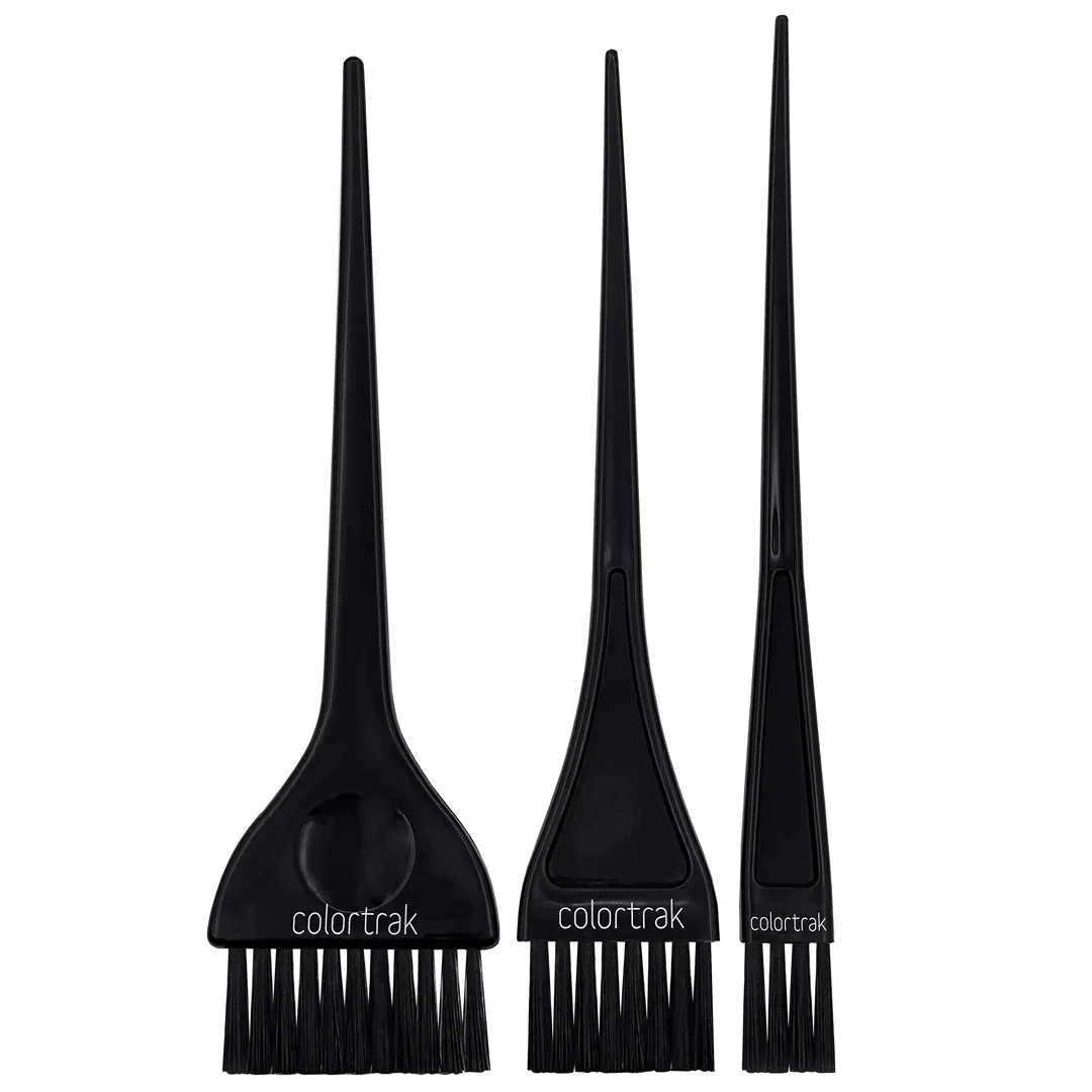 Zestaw profesjonalnych pędzelków do farbowania włosów Colortrak. Pędzle mają twardsze włosie. Różnią się szerokością. Wykonane z wytrzymałego tworzywa.