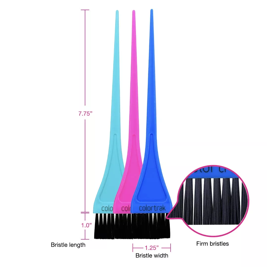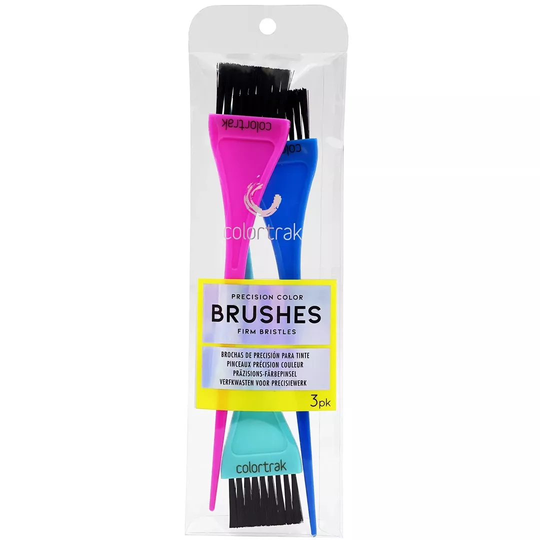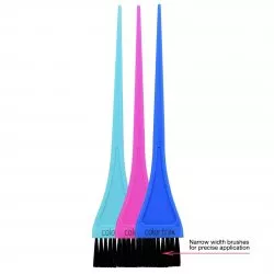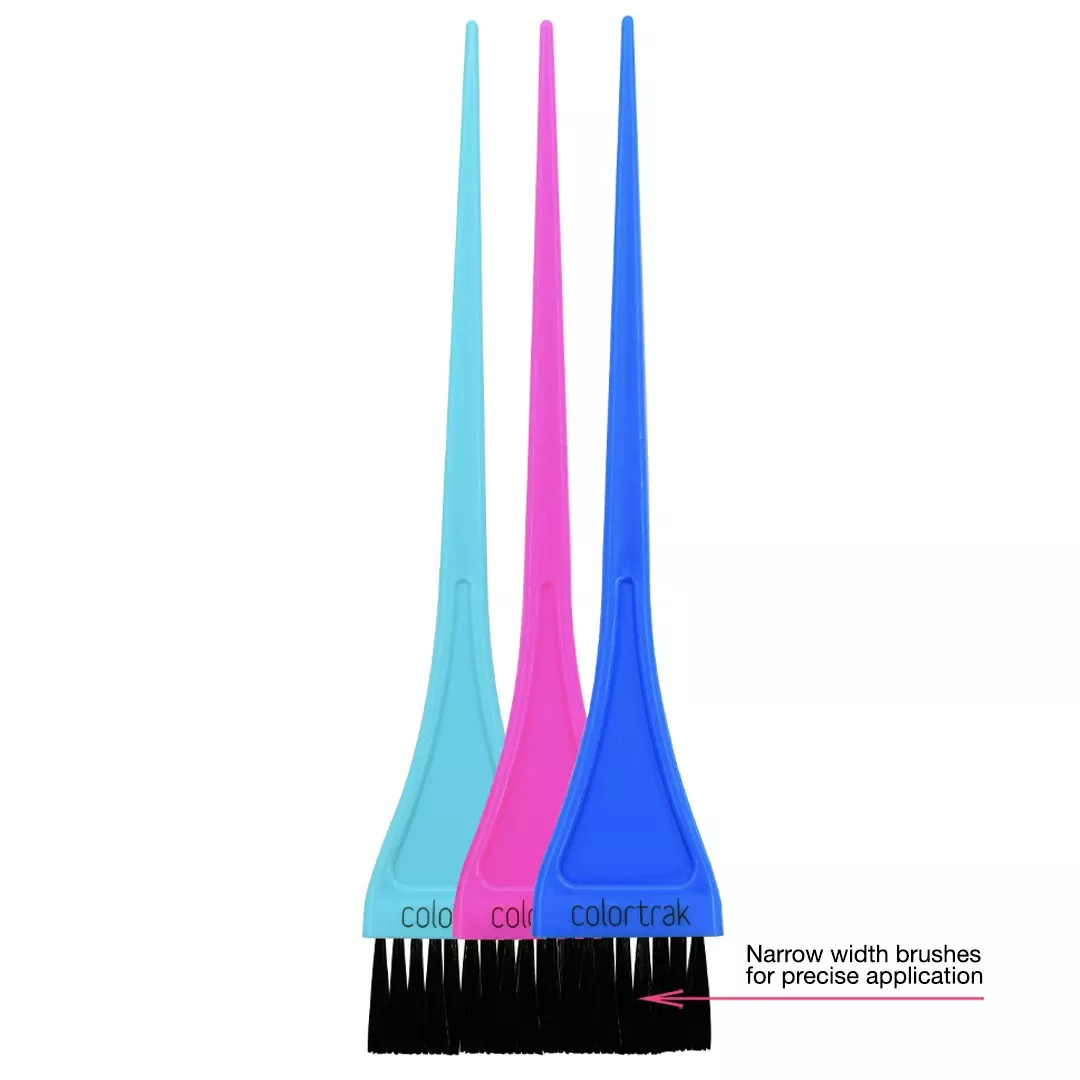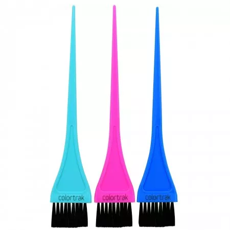 Praktyczne pędzelki do koloryzacji włosów Colortrak Precision Color. Pędzle posiadają wąskie włosie, idealne do precyzyjnych aplikacji. Dodatkowym atutem jest twardsze włosie. Szerokość włosia: 3,71cm. Długość całkowita pędzli: 22,2cm. W zestawie 3 sztuki.