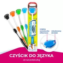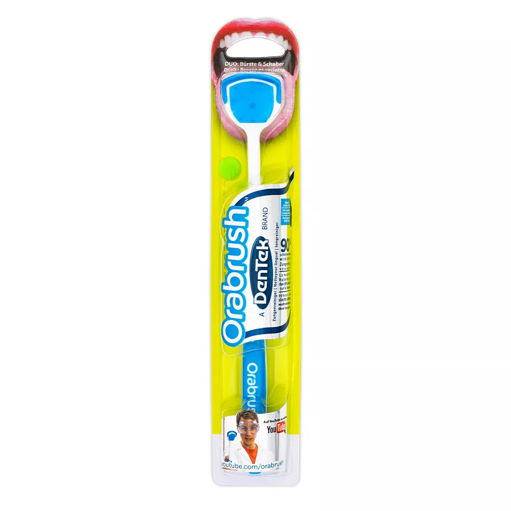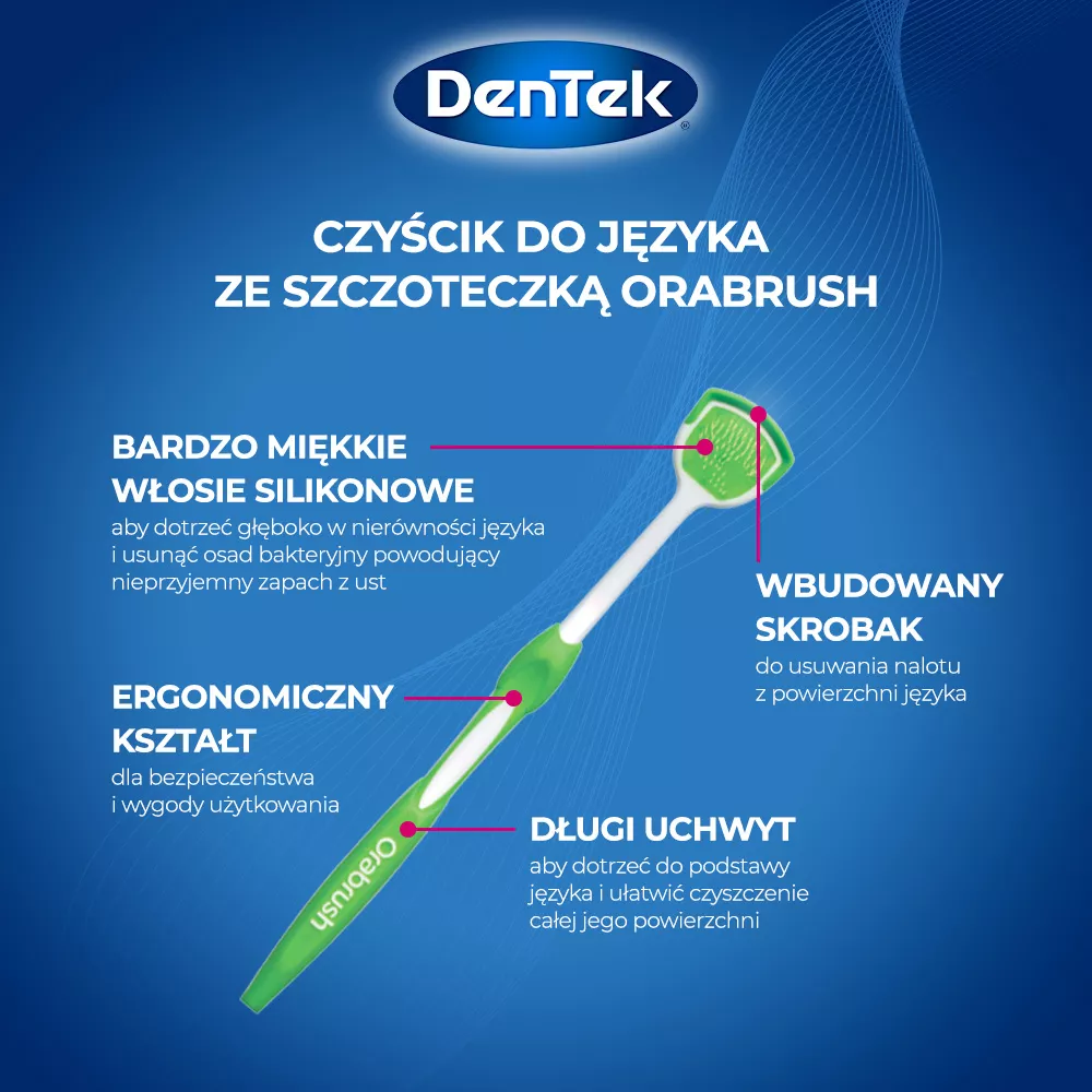 DenTek OraBrush to innowacyjny czyścik do języka ze szczoteczką, stworzony, aby zapewnić lepszą higienę jamy ustnej niż tradycyjna szczoteczka do zębów. Jego wyjątkowy design, inspirowany czyścikami chirurgicznymi, skutecznie usuwa bakterie i nalot z nierównej powierzchni języka, pomagając w utrzymaniu świeżego oddechu i ochronie zębów przed próchnicą.