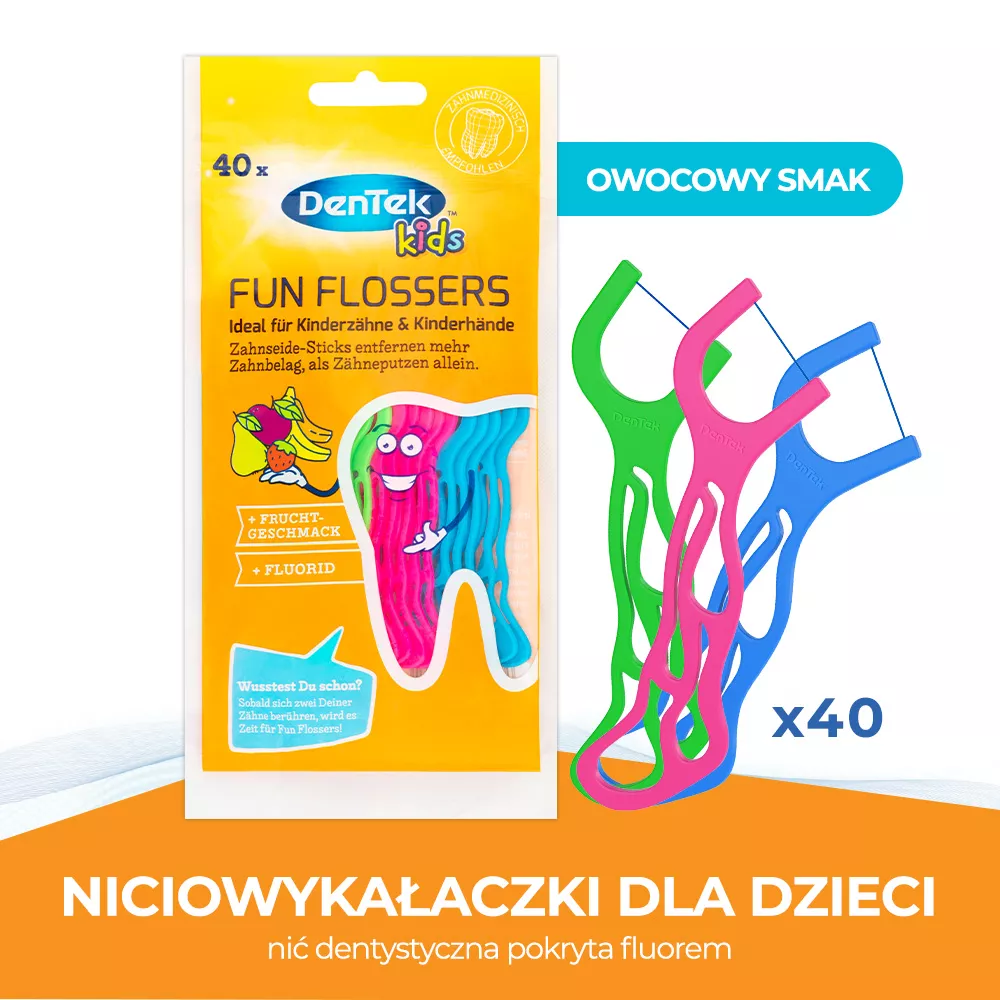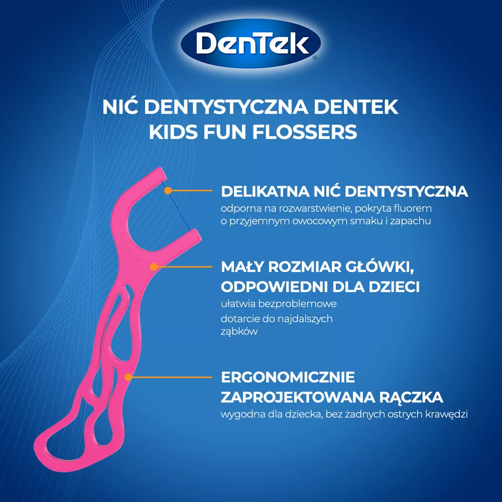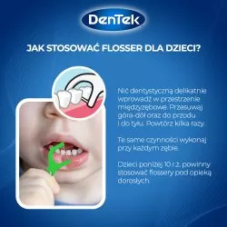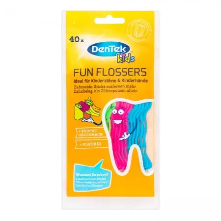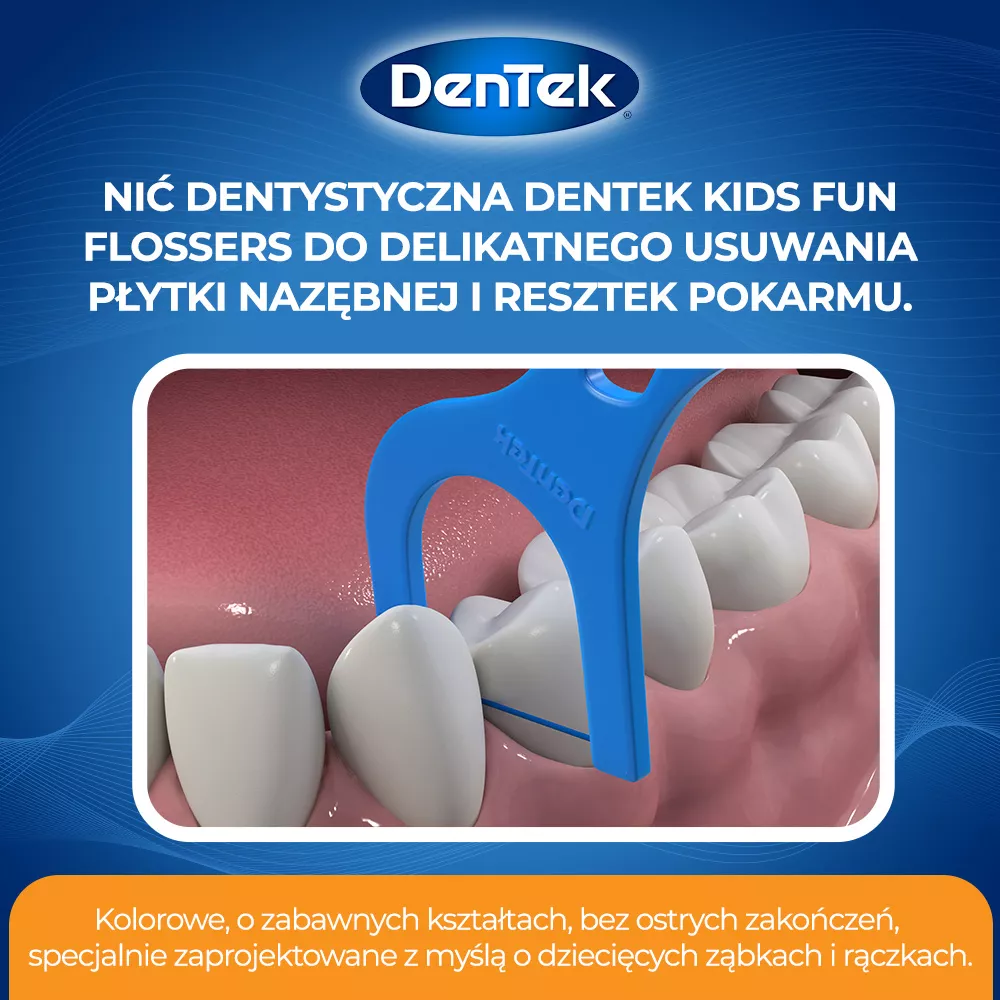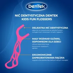Dentek, niciowykałaczki Kids Fun Flosser to wesołe urozmaicenie codziennej rutyny pielęgnacji zębów dla dzieci. Te kolorowe flossery są łatwe w użytkowaniu, mają zabawne kształty i są idealnie dopasowane do dziecięcych zębów oraz rączek. Nić dentystyczna pokryta fluorem ma owocowy smak i zapach, co sprawia, że usuwanie płytki nazębnej i resztek pokarmu staje się przyjemniejsze.