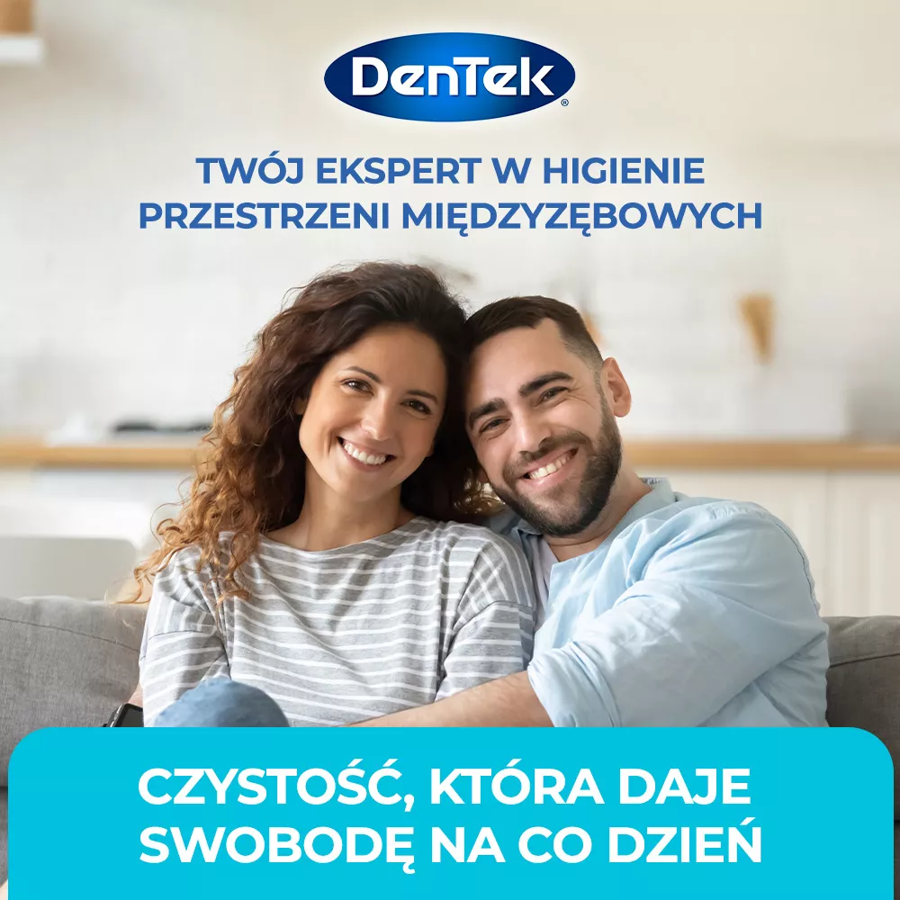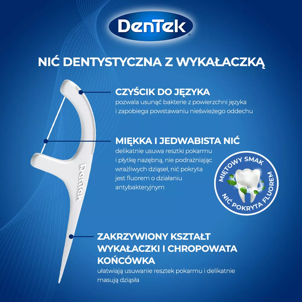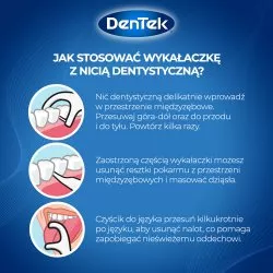 Miękkie nici dentystyczne z wykałaczkami DenTek Sensitive Clean zostały zaprojektowane, by ułatwić nitkowanie wrażliwych zębów i dziąseł. Gładka jedwabista nić delikatnie usuwa resztki pokarmu i płytkę nazębną, nie podrażniając wrażliwych dziąseł. Ergonomiczny kształt i długa rączka niciowykałaczek DenTek pozwalają precyzyjnie dotrzeć zarówno do przednich, jak i tylnych zębów, doskonale wpasowując się w wąskie szczeliny międzyzębowe. Regularne nitkowanie pomaga utrzymać prawidłową higienę jamy ustnej, wspomagając usuwanie resztek jedzenia i osadu nazębnego, co zapobiega próchnicy, chorobom dziąseł i nieświeżemu oddechowi.