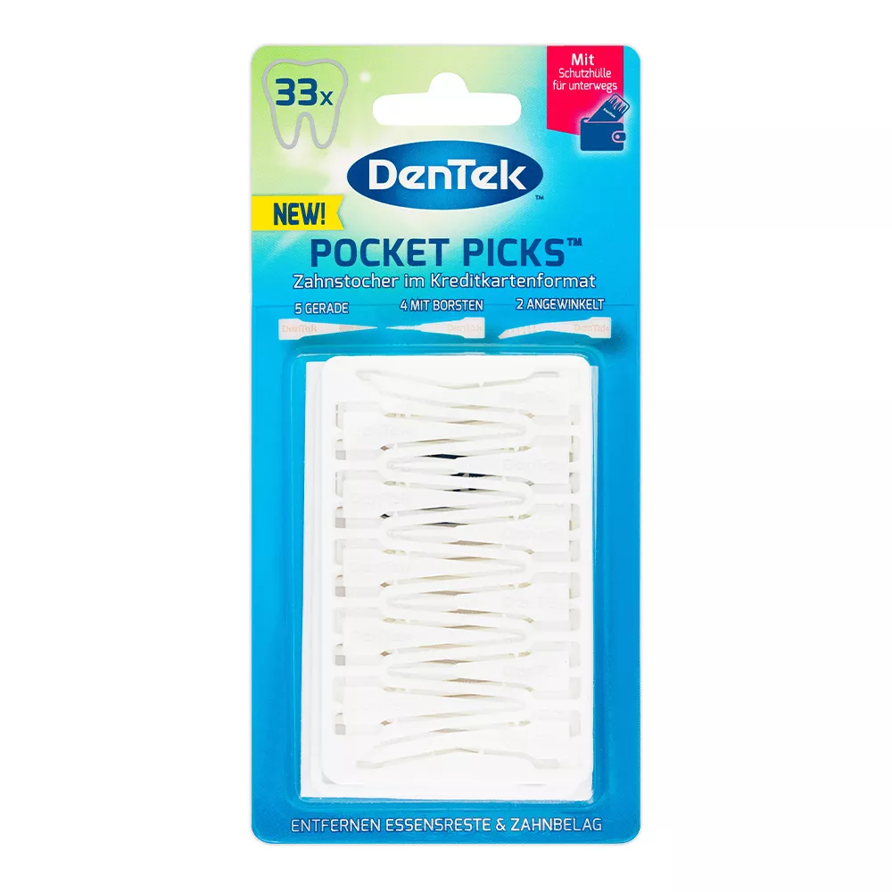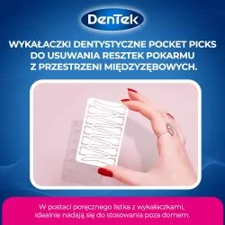 Wykałaczki dentystyczne DenTek Pocket Picks zostały zaprojektowane, aby ułatwić czyszczenie przestrzeni międzyzębowych. Zestaw zawiera 12 sztuk trzech rodzajów wykałaczek: prostych, z włoskami i zakrzywionych. Każdy listek ma rozmiar karty kredytowej, co czyni je idealnymi do noszenia w portfelu. Wykałaczki są opakowane w praktyczne etui, które utrzymuje je w czystości, dzięki czemu świetnie nadają się do stosowania poza domem.