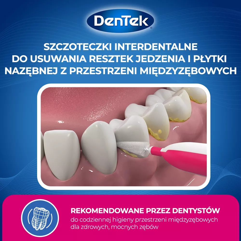 Szczoteczki interdentalne DenTek Easy Brush to idealne narzędzie do czyszczenia przestrzeni międzyzębowych. Dzięki stożkowatemu kształtowi, szczoteczki te skutecznie docierają do trudno dostępnych miejsc, takich jak przestrzenie wokół aparatów ortodontycznych, implantów, koron i mostów. Cienkie, ale wytrzymałe włosie pokryte fluorem zapewnia ochronę przed próchnicą, a miętowy smak pozostawia uczucie świeżości na dłużej. Z higienicznymi zatyczkami, są doskonałe na podróże, zapewniając długotrwałą czystość i wygodę użytkowania.