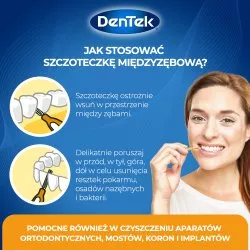 - Wsuń szczoteczkę DenTek delikatnie między zęby, w przestrzenie międzyzębowe lub aparaty dentystyczne.