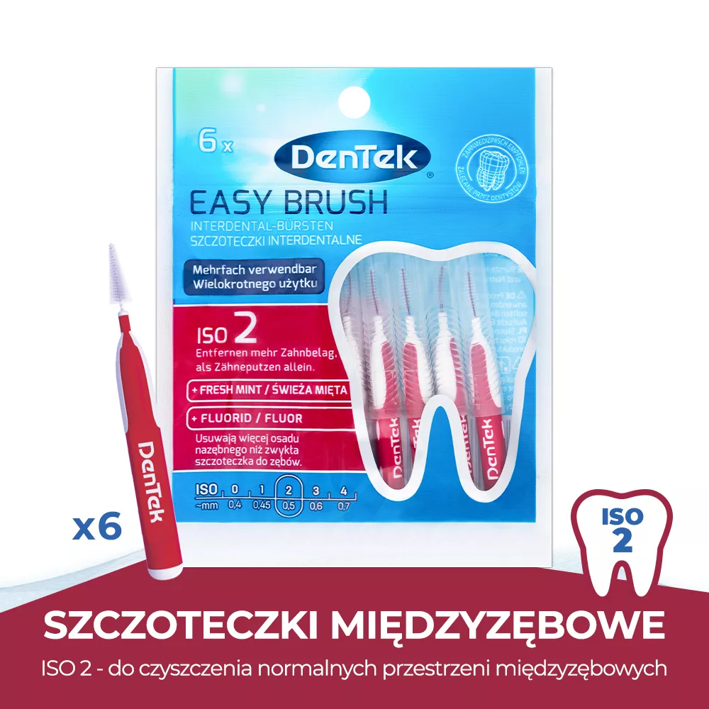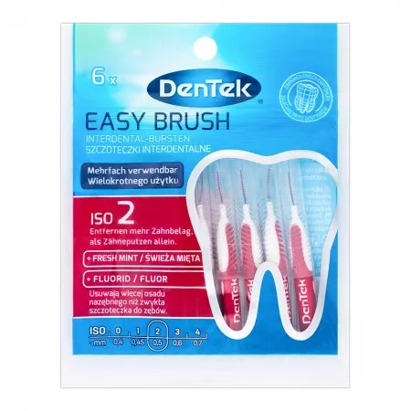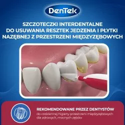 Szczoteczki interdentalne DenTek EasyBrush to doskonałe narzędzie do codziennej higieny jamy ustnej. Dzięki stożkowatemu kształtowi, skutecznie czyszczą trudno dostępne przestrzenie między zębami, aparatami ortodontycznymi, implantami, koronami i mostami. Łatwe w użyciu, delikatne dla zębów i dziąseł, zapewniają wyjątkową wygodę użytkowania. Włosie pokryte fluorem chroni zęby przed próchnicą, a miętowy smak dodaje uczucia świeżości.