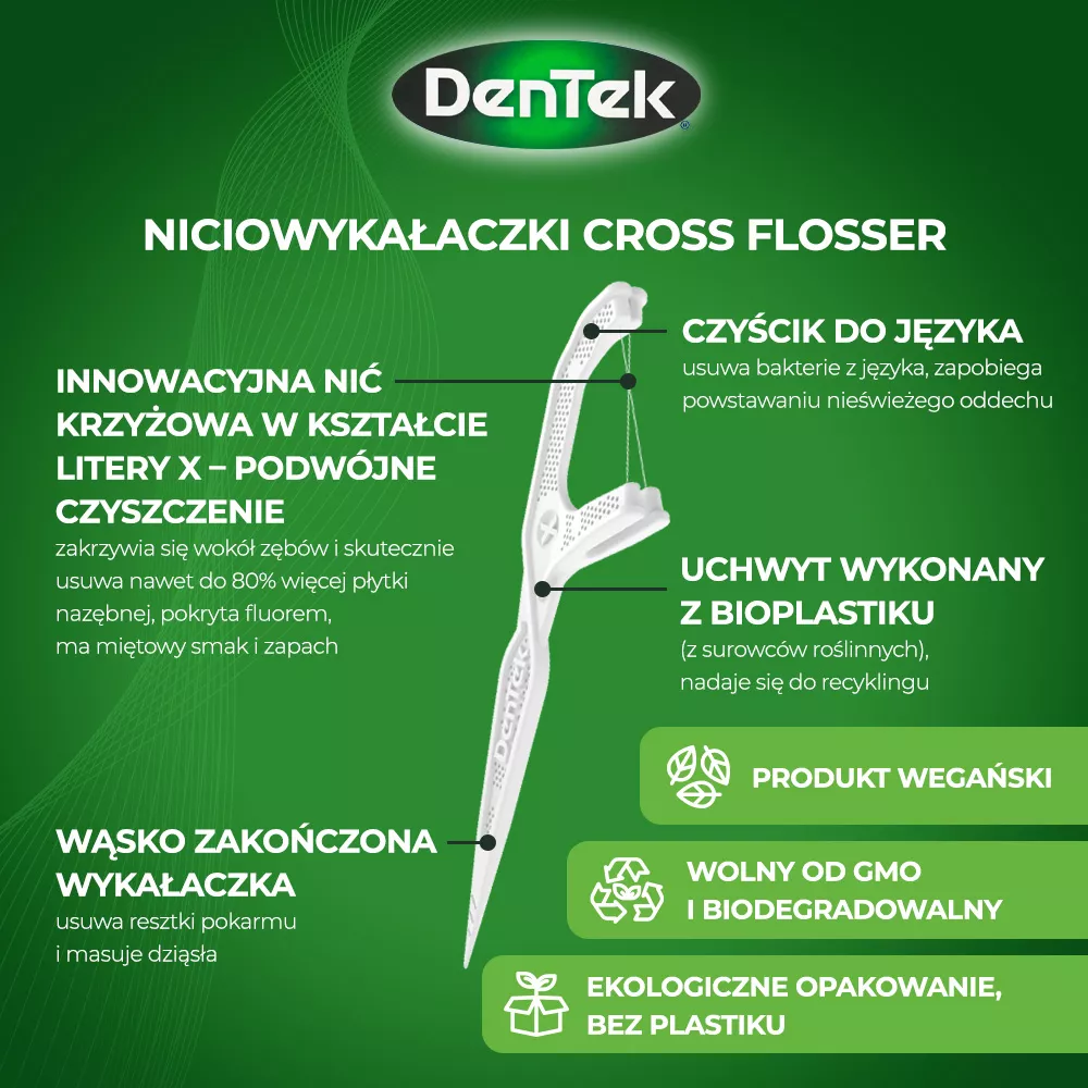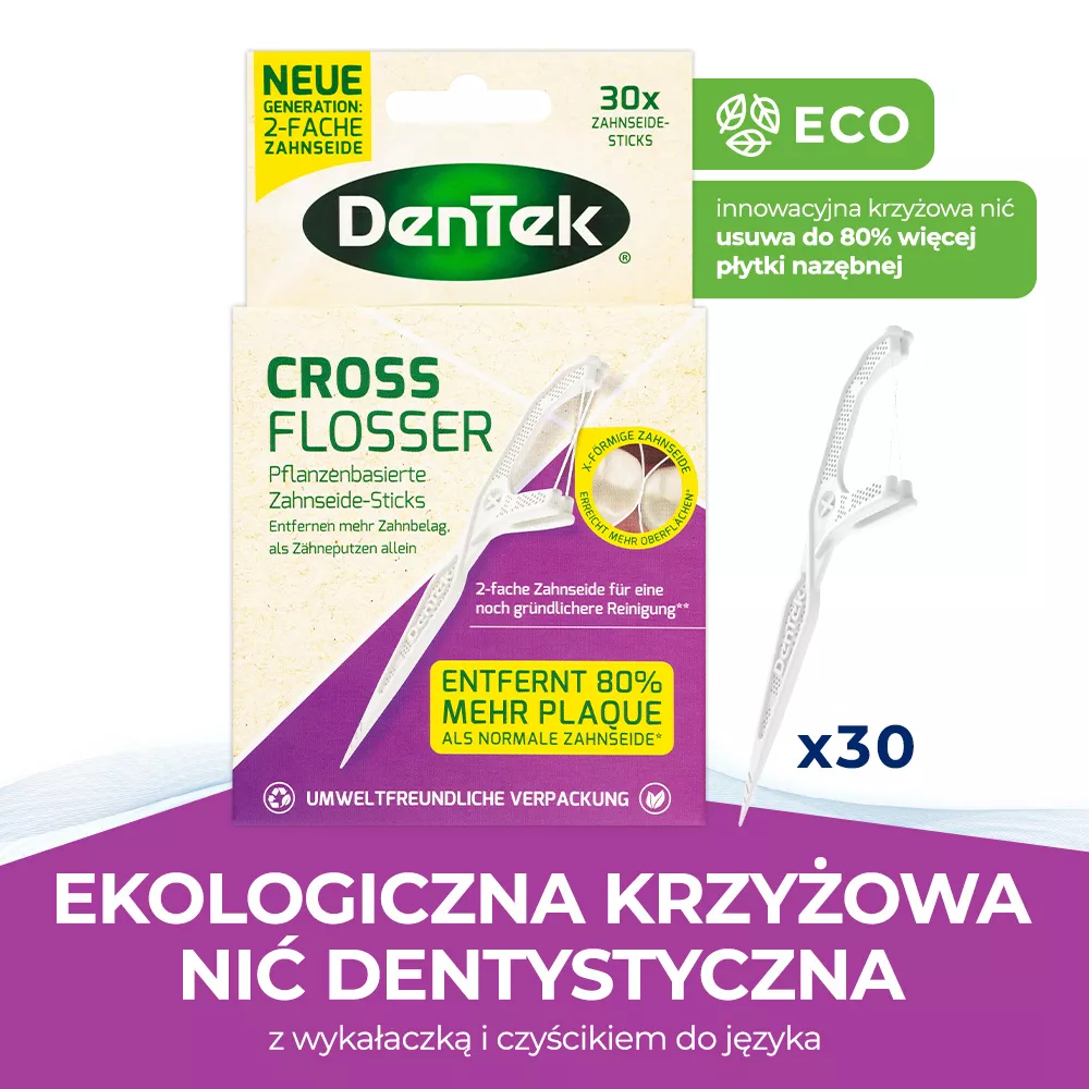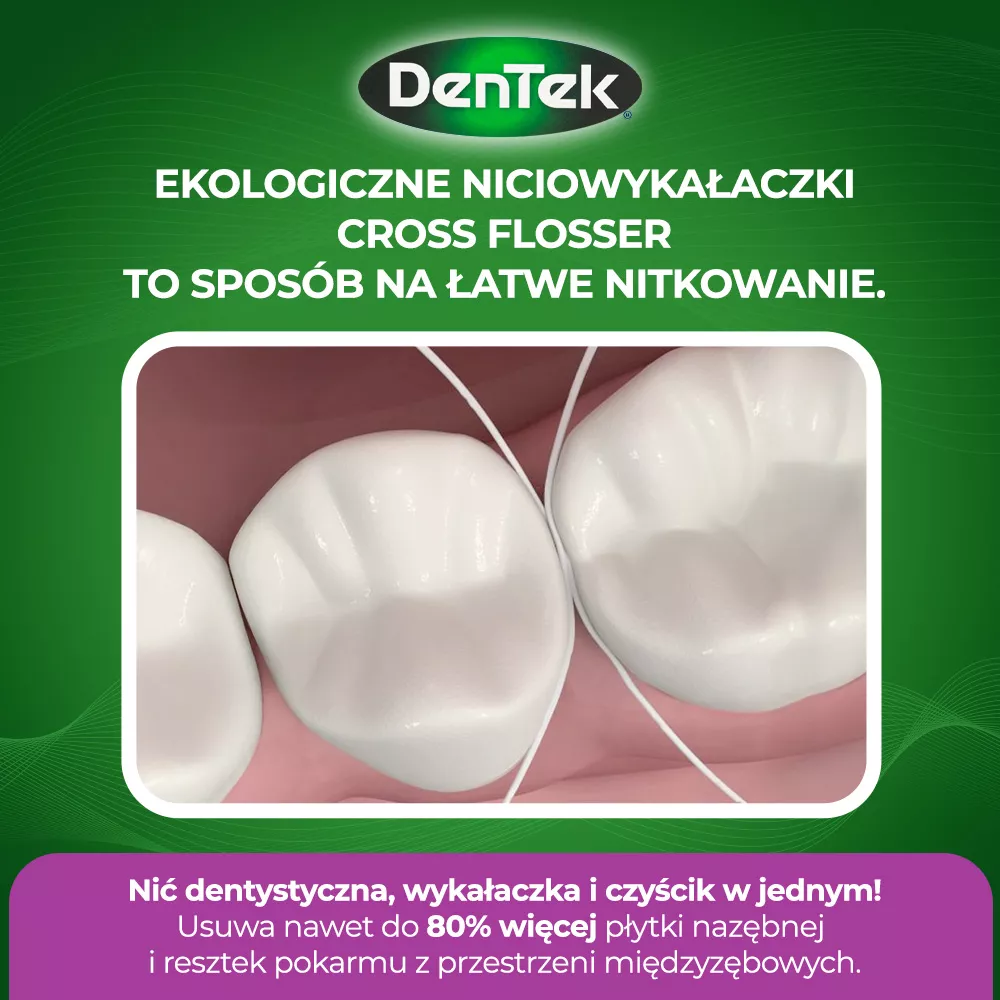 Ekologiczne komfortowe nici dentystyczne z wykałaczkami DenTek Eco Cross Flosser zostały zaprojektowane z myślą o łatwym i skutecznym nitkowaniu. Innowacyjna nić krzyżowa w kształcie litery X efektywnie zakrzywia się wokół zębów, usuwając do 80% więcej płytki nazębnej i delikatnie masując dziąsła. Produkt jest przyjazny dla środowiska, z uchwytem wykonanym z recyklingowalnego bioplastiku, co zmniejsza emisję dwutlenku węgla o 80% w porównaniu do tradycyjnych materiałów.