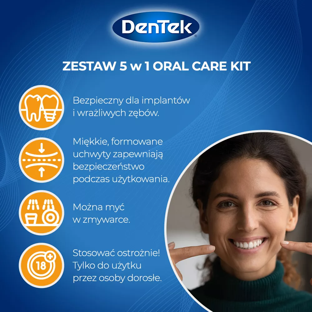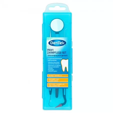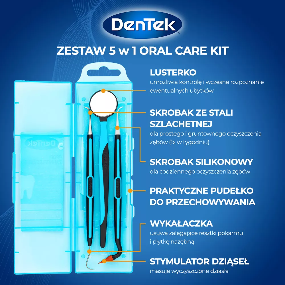 Stosuj DenTek Oral Care Kit jako uzupełnienie codziennej higieny jamy ustnej pomiędzy regularnymi wizytami u dentysty. Używaj narzędzi do usuwania resztek jedzenia i kamienia z powierzchni zębów oraz przestrzeni międzyzębowych. Korzystaj z lusterka, aby monitorować trudno dostępne miejsca.