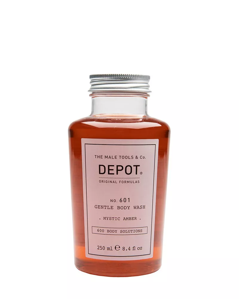 Żel do mycia ciała dla mężczyzn Depot No. 601 delikatnie oczyszcza skórę bez podrażnień i naruszania jej naturalnej bariery ochronnej, pozostawiając skórę przyjemnie miękką i gładką w dotyku. W składzie znajduje się kompleks botaniczny 10 ziół dla dobrej kondycji skóry, nawilżająca gliceryna i erythritol dbający o wygładzenie skóry.